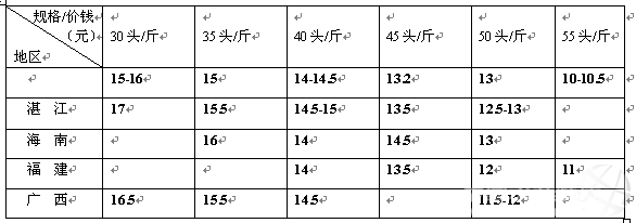 經過一個星期的強降雨,各地區的對蝦價格并未出現太大的波動,其中廣東中山因為其投放大多是中造蝦苗,預防措施到位,受災不嚴重,因此對蝦價格并未受到影響,同比上周略有增漲。珠三角、福建、湛江、海南、廣西等地對蝦價格表,見下圖表格(1-1)所示。