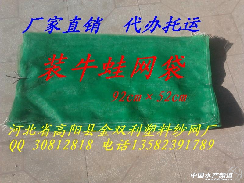 各位搞水產(chǎn)批發(fā)和收購的朋友們大家好,我是河北省高陽縣金雙利塑料紗網(wǎng)廠,我廠常年生產(chǎn)銷售水產(chǎn)養(yǎng)殖網(wǎng)袋,(92cm×52cm和92cm×48cm兩種規(guī)格,可裝牛蛙、泥鰍、螃蟹、魚類等)如果哪位朋友需要請和我聯(lián)系,代辦托運(yùn)。 電話 13582391789 韓利坤 QQ 30812818。打擾之處 敬請諒解。