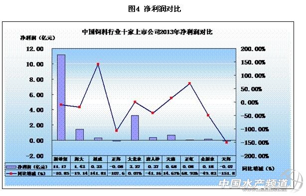 凈利潤方面,今年上半年10大上市公司的情況是2家企業負增長,4家同期比呈負增長,4家保持增長。通威股份2013年上半的凈利潤為3178.38萬元,同比增長141.81%。大北農凈利潤32693.16萬元,同比增長0.07%。天康生物凈利潤6823.52萬元,同比增長14.67%。正虹773.21萬元,同比增長68.93%。正邦科技,2013上半年的凈利潤為負767.92 萬元,較上年同期減少107.66%;歸屬于上市公司股東的凈利潤472.41萬元,較上年同期減少94.68%。天邦股份上半年的凈利潤也虧損699.39萬元。金新農、唐人神、海大集團、新希望六和,較上年同期下降幅度分別為 49.83%、41.16%、19.14%、10.85%。
