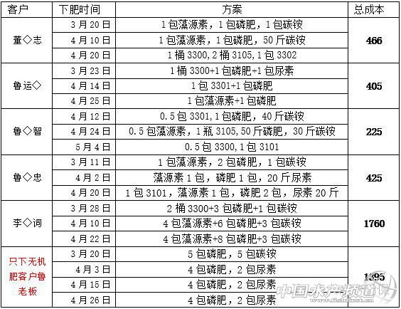 本次統計該區域6個客戶,其中5個使用海大肥水方案,1個使用常規無機肥方案,具體信息如下表: