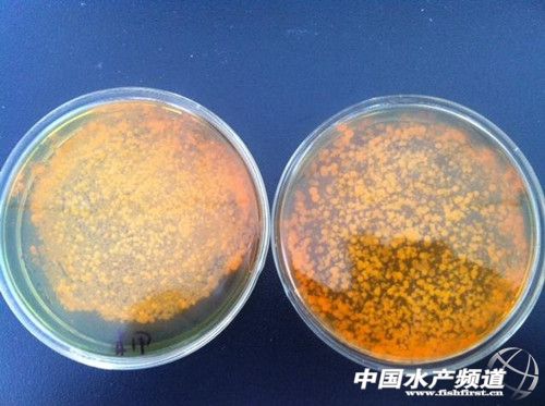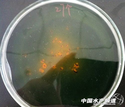 浙江杭州曹氏水產養殖有限公司,在蕭山農業對外綜合開發區圍墾十七工段有土塘280畝(放苗6-7萬尾/畝),且自有蝦苗淡化場。2012年8月,兩個蝦塘開始偷死,原因不詳。后通過對養殖水樣的分析檢測、細菌的分離培養鑒定,得出結論:致病弧菌引起偷死(圖1)。