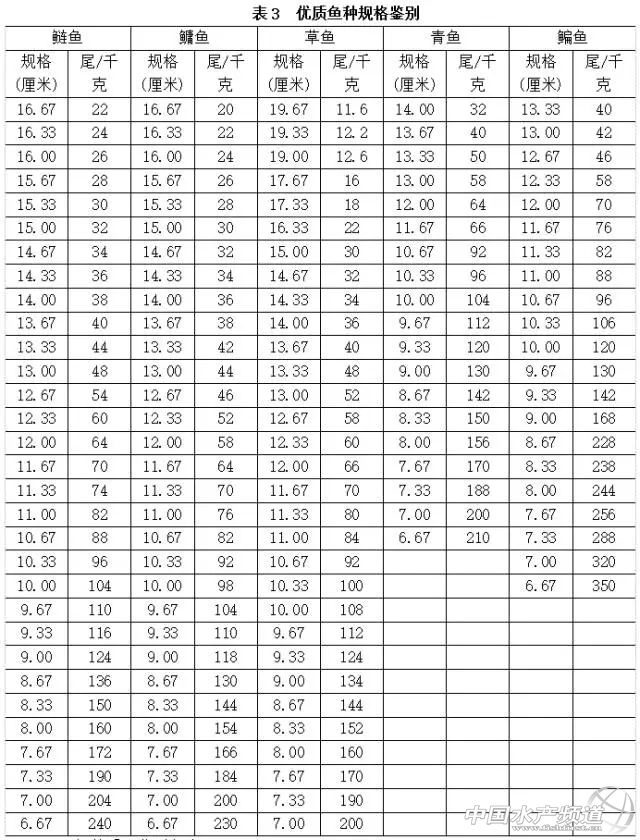 優(yōu)質(zhì)魚(yú)種必須具備以下幾項(xiàng)條件:①同池同種魚(yú)種規(guī)格均勻;②體質(zhì)健壯,背部肌肉肥厚,尾柄肉質(zhì)肥滿;③體表光滑,無(wú)病無(wú)傷,鱗片、鰭條完整無(wú)損;④體色鮮艷有光澤;⑤游泳活潑,溯水性強(qiáng),在密集時(shí),頭向下尾向上鰭不斷扇動(dòng);⑥用魚(yú)種體長(zhǎng)與體重之比來(lái)判斷質(zhì)量好壞。具體做法是:抽樣檢查,稱取規(guī)格相似的魚(yú)種500克計(jì)算尾數(shù),然后對(duì)照優(yōu)質(zhì)魚(yú)種規(guī)格鑒別表(表3),每千克魚(yú)種所稱尾數(shù)等于或少于標(biāo)準(zhǔn)尾數(shù)為優(yōu)質(zhì)魚(yú)種;反之,則為劣質(zhì)魚(yú)種。
