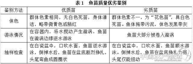 魚(yú)苗因受魚(yú)卵質(zhì)量和孵化過(guò)程中環(huán)境條件的影響,體質(zhì)有強(qiáng)有弱,這對(duì)魚(yú)苗的生長(zhǎng)和成活帶來(lái)很大影響。生產(chǎn)上可根據(jù)魚(yú)苗的體色、游泳情況以及掙扎能力來(lái)區(qū)別其優(yōu)劣。鑒別方法見(jiàn)表1。