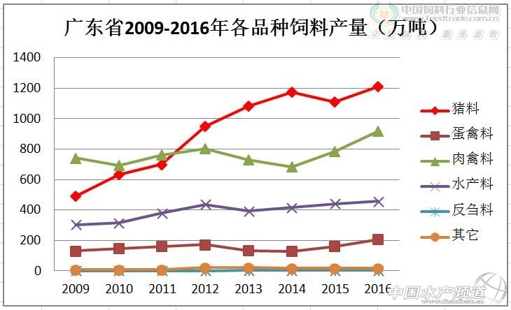 從2009-2016年廣東的飼料產量來看,2013年似乎是個分界點,除當年飼料產量受流感影響下滑外,分界點之前四年和之后三年飼料產量每年都保持了一定的增長,不過前四年的增長幅度較大,保持在7-10%的增長,而在經歷了2013年流感之后的三年,雖仍舊保持著一定的增長,但幅度明顯放緩,大約3-4%,可見當年的流感對整個行業的影響程度比較大,尤其是禽類飼料的產量,下文詳細闡述。而2016年產量有了較大幅度的增長,漲幅超過10%,與豬料和肉禽料的大幅增長有關。