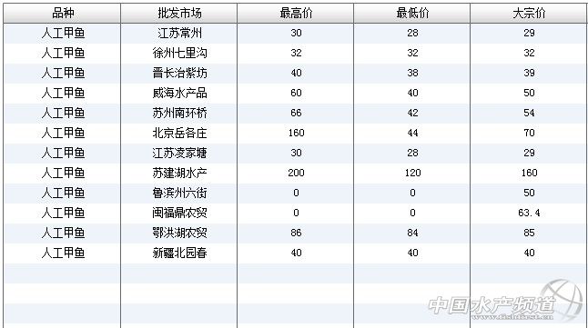 6月8日全國(guó)主要批發(fā)市場(chǎng)人工甲魚價(jià)格行情如下 06-09