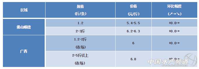 文/ 粵海飼料集團 中國水產頻道 彭曉君 中國水產頻道原創獨家報道,廣西區域:目前叉尾凍廠開工很少,叉尾主要走市場為主,因為1.2-2斤較適合家庭消費,近期價格高位企穩,2-5斤的規格超出家庭消費范疇,鮮活市場相對疲軟。 ※上述報價可能會因區域、規格、品質和時間等因素的不同而會產生差異,在此僅供參考。環比幅度以上周價格與本周價格數據做對比。 【關鍵字】:叉尾鮰 叉尾鮰價格 水產養殖 |