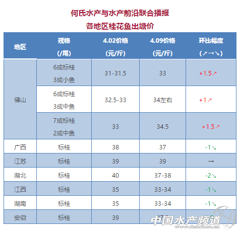 中國水產頻道獨家報道, 鱖魚、加州鱸、生魚、黃顙魚、江團4月9日最新塘頭價 文/圖何氏水產、水產前沿李靜 桂花魚 1、廣東桂魚在上周5號開始開塘價格又現小幅上漲,從33元/斤左右上漲到34元/斤左右,漲幅1元/斤,7成標桂的最高訂魚價格在34.5元左右。主要原因可能有以下幾個方面:上周是清明節,開工的收購商較之前少;前期部分收購商高價定的魚也差不多出完了,手上的魚不多;還有就是天氣突然降溫,這幾天出魚量比較少,市場出現短暫性的缺魚。為了滿足市場需求,加價訂魚回來,導致開塘價格上升了。 2、除了江蘇標桂價格不變外,受到前期廣東價格下跌的影響,其他地區價格都出現不同程度的下滑,跌幅在1-2元/斤之間。 【關鍵字】:桂花魚 出塘價 水產養殖 |