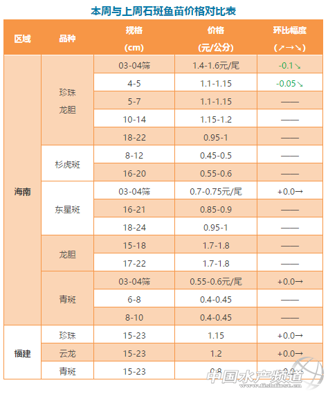 中國水產頻道獨家報道, 文/海南晨海水產有限公司 萊州明波水產有限公司 三通生物工程(濰坊)有限公司 水產前沿吳佳輝 養殖要豐產,更要豐收 石斑、斑石鯛 塘頭最新報價周四見! 石斑魚 福建:2017年孵化、8月份中苗下高位池的云龍斑,目前80%已達到1.3-2斤并開始出售。總體表現上,云龍斑過冬能力和生長速度優于珍珠龍膽。 海南:這段時間的市場需求量比較低,小規格珍珠價格下跌。不過,對比上周的石斑魚價格,可以發現,大規格的珍珠價格有所上漲,老虎斑的價格也上漲了2元/斤。 石斑魚苗 海南:本期珍珠白身苗出苗量較大,但由于區域和規格的差異,價格也在1.4-1.6元不等。東星斑小苗相對緊張,由于前段時間投蟲量不足造成瘦身苗較多,導致標粗成活率低。 相關鏈接 海南石斑魚價跌,但很快會反彈;福建地區價格較為平穩,漲跌互現 珍珠、杉虎斑、東星斑最高漲2元!養戶投苗熱情高珍珠苗賣斷貨 珍珠龍膽魚卵價格波動大,清明前后將進入投苗高峰期 最高53元/斤,石斑魚價持續高企!清明將至,投苗迎來高潮 魚價同比理想,近期價格將持續波動4月5日石斑魚價格播報 公告 近期進入石斑魚投苗期,小編想整理市場上的優質苗企,歡迎大家舉薦。投票選出的企業,小編將進行采訪,并發布購種指南,優先推薦當選企業。 中國水產頻道會持續收集和發布海鱸、石斑商品魚行情信息,發布的行情信息會經過嚴格審核,最新行情爆料請與筆者聯系(添加微信號:13922350546(wxid_f4cer4azkid422)或者發送郵箱wjh fishfirst.cn)。 【關鍵字】:石斑魚 價格 水產養殖 |