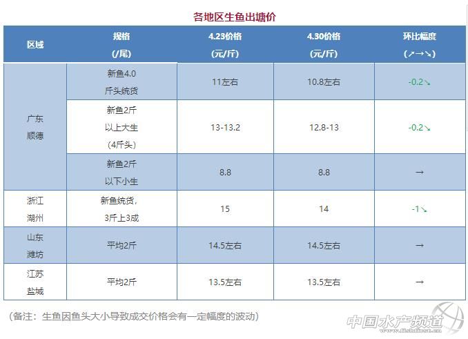 2、浙江湖州地區受廣東生魚價格影響跌1元/斤,其他地區價格與上周一致。