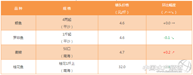 文/ 珠海海龍、中國水產(chǎn)頻道 吳佳輝 中國水產(chǎn)頻道原創(chuàng)報道,2018年5月4日珠三角地區(qū)鯽魚、羅非魚、麥鯪、桂花魚塘頭價格如下: 【關鍵字】:鯽魚 羅非魚價格 水產(chǎn)養(yǎng)殖 |