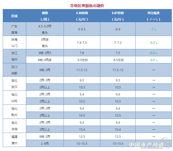 2、浙江湖州那邊價格與廣東情況差不多,3兩多魚頭價格又下跌了0.3元/斤,4兩多魚頭的價格也下跌了0.5元/斤。雖然當地銷量大,但存塘量還是很多,價格短期內也很難上漲,當地2兩以下的小魚售價只有5-6元/斤。其他地區與上周持平。