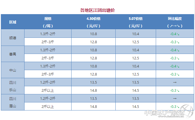 文/圖 何氏水產(chǎn)、水產(chǎn)前沿 李靜 江團(tuán) 1、廣東江團(tuán)上周價格繼續(xù)下跌,大魚下跌了0.3元/斤,小魚下跌了0.4元/斤,主要是現(xiàn)在市場行情不好,銷量少,但小魚的存塘量還是比較多,外省本地魚也在大量出魚,導(dǎo)致廣東需求量下降,價格持續(xù)下跌,現(xiàn)在本地魚與廣東魚的差價也不大,價格下跌的空間不大,銷量相對穩(wěn)定。預(yù)測本周價格相對穩(wěn)定。 2、四川江團(tuán)上周小魚價格不變,大魚價格下跌了0.3元/斤,目前當(dāng)?shù)氐拇嫣亮磕軡M足市場銷量,預(yù)測價格相對穩(wěn)定。 |