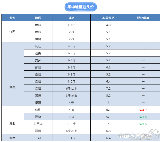湖北:本周湖北地區(qū)草魚價格整體保持穩(wěn)定,部分地區(qū)大草魚價格有所上漲,其中天門地區(qū)上漲0.2元。 華東地區(qū)