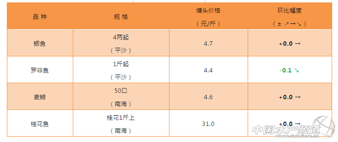 中國水產頻道原創報道,2018年5月18日珠三角地區鯽魚、羅非魚、麥鯪、桂花魚塘頭價如下: