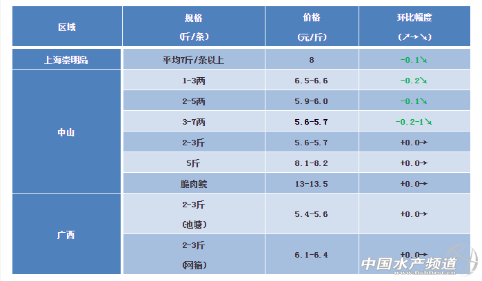 文/ 粵海飼料集團(tuán)、中國(guó)水產(chǎn)頻道 彭曉君 中國(guó)水產(chǎn)頻道原創(chuàng)報(bào)道,中山區(qū)域:小規(guī)格魚(yú)種價(jià)格下跌,超市草魚(yú)近期市場(chǎng)價(jià)格繼續(xù)小幅下降,5斤以上存塘量少價(jià)格堅(jiān)挺,氣溫回升,脆肉價(jià)格仍處高位。 上海區(qū)域: 草魚(yú)價(jià)格正常穩(wěn)定波動(dòng),略有下降,屬于正常的行情周期,預(yù)計(jì)后期繼續(xù)小幅震動(dòng)。 廣西區(qū)域:部分地區(qū)受近期內(nèi)陸網(wǎng)箱拆除,成品魚(yú)急著出魚(yú),積壓價(jià)低的影響,草魚(yú)近期整體呈下行趨勢(shì)。 ※上述報(bào)價(jià)可能會(huì)因區(qū)域、規(guī)格、品質(zhì)和時(shí)間等因素的不同而會(huì)產(chǎn)生差異,在此僅供參考。環(huán)比幅度以本周價(jià)格與上周價(jià)格數(shù)據(jù)做對(duì)比。 【關(guān)鍵字】:草魚(yú) 草魚(yú)價(jià)格 水產(chǎn)養(yǎng)殖 |