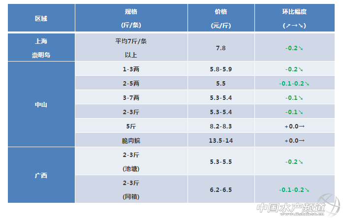 中國水產頻道原創報道,中山區域:魚種價格下跌,超市草魚近期市場價格繼續下降,5斤以上存塘量少價格堅挺,進入夏天,脆肉價格仍處高位。