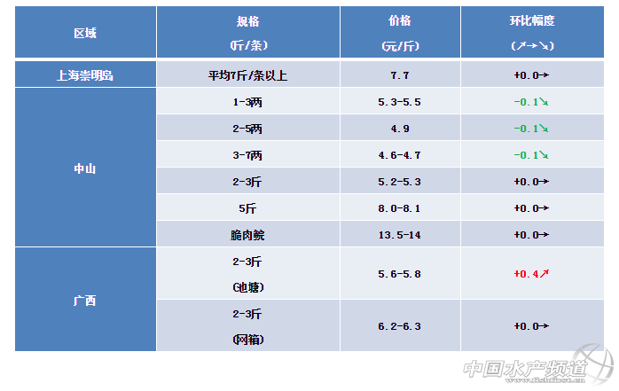 文/ 粵海飼料集團、中國水產(chǎn)頻道 彭曉君 中國水產(chǎn)頻道原創(chuàng)報道,中山區(qū)域:魚種價格下跌,超市草魚近期市場價格處于低位,5斤以上存塘量少價格下跌。進入夏天,脆肉價格仍處高位。 上海區(qū)域:草魚價格穩(wěn)定,銷量和行情相對穩(wěn)定,預(yù)計后期價格仍會保持穩(wěn)定狀態(tài)。 廣西區(qū)域:近期草魚存塘量少,需求量上升,價格有所上漲。 ※上述報價可能會因區(qū)域、規(guī)格、品質(zhì)和時間等因素的不同而會產(chǎn)生差異,在此僅供參考。環(huán)比幅度以本周價格與上周價格數(shù)據(jù)做對比。 【關(guān)鍵字】:草魚 草魚價格 水產(chǎn)養(yǎng)殖網(wǎng) |