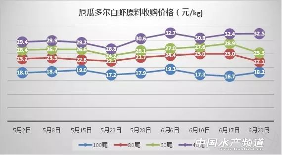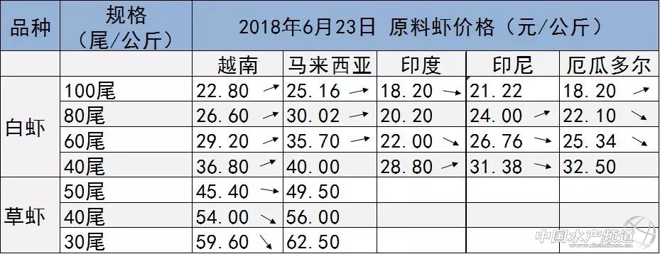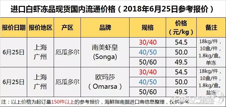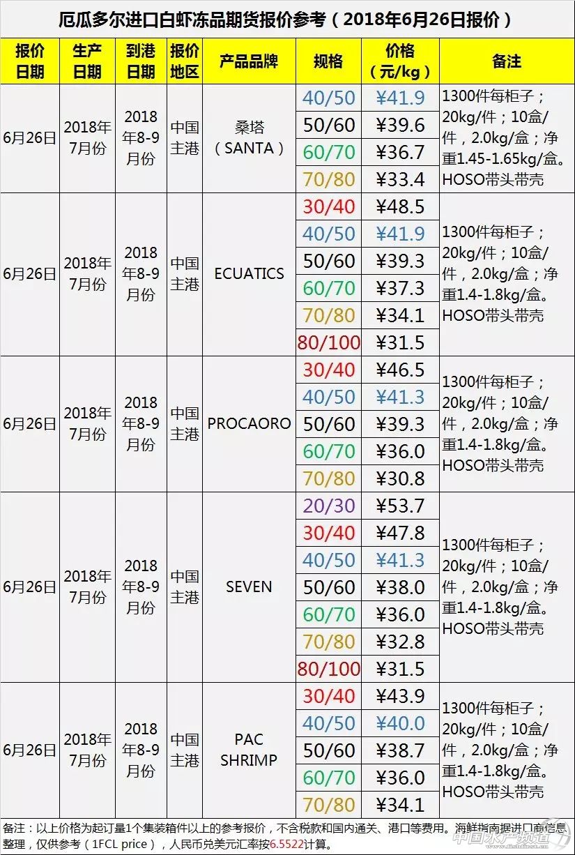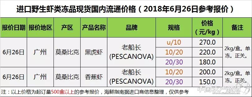 文/圖 海鮮指南(seafood-guide) 張麗麗、陳磊 中國水產頻道報道, 海外白蝦塘頭價格 注:以上產品為當地蝦類的塘頭收購價,匯率當地貨幣實時兌換人民幣計算 注:以上產品為當地蝦類的塘頭收購價,匯率按泰銖:人民幣=0.1993:1計算 本周(2018年5月30日-6月6日)全球白蝦主產區中,越南、泰國、馬來西亞白蝦原料價格上揚,厄瓜多爾、印度、印尼價格震蕩漲跌互現。具體如下: 越南白蝦價格上升明顯。與上周相比,各規格蝦價漲幅為2.4-2.6元/公斤。業內人士分析,與邊貿走私回暖有關。 馬來西亞白蝦止跌回升。與上周相比,60、80、100尾/公斤各規格蝦價漲幅為1.8元/公斤,40尾/公斤漲幅較小約為0.5元/公斤。 印度白蝦價格出現回落,個別規格價格上升。與上周相比,60尾/公斤白蝦降幅最大為1.4元/公斤,其次是100尾/公斤規格降幅為0.4元/公斤,40尾/公斤規格漲幅為0.6元/公斤。 印尼白蝦價格小幅下行,個別規格價格上升。與上周相比,100尾/公斤價格與上周基本持平,80尾/公斤白蝦價格堅挺上揚,漲幅為1.4元/公斤,40、60尾/公斤規格降幅約0.9元/公斤。 泰國白蝦價格普遍上漲。與上周相比,60-10尾/公斤規格蝦價漲幅在0.8-1.2元/公斤居多,其中78-80尾/公斤漲幅最高,達1.6元/公斤。100-130尾/公斤白蝦漲幅則相對較小,為0.4-0.6元/公斤。130-150尾/公斤小規格白蝦則略有下跌,跌幅在0.2-0.3元/公斤。 厄瓜多爾白蝦價格震蕩劇烈,漲跌互現。與上周相比,100尾/公斤規格漲幅為1.5元/公斤,但80尾/公斤白蝦卻跌價明顯降幅達2.9元/公斤,60尾/公斤規格降幅更大達3.5元/公斤,跌至近兩個月以來最低價格。40尾/公斤白蝦與上周基本持平。 本周,越南草蝦價格大跌,其中40尾/公斤草蝦價格降幅為8元/公斤,30尾/公斤草蝦價格降幅高達16.4元/公斤;馬來西亞草蝦價格穩中略升,與上周相比漲幅在0.4元/公斤。 本期新增進口阿根廷紅蝦、野生莫桑比克黑虎蝦、香蕉蝦凍品現貨流通行情,供國內市場參考,具體如下: 注:如需以上貨源,請加微信與筆者聯系。 |