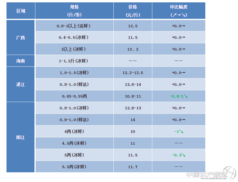 文/ 粵海飼料集團、中國水產頻道 彭曉君 中國水產頻道原創獨家報道,廣西區域:目前過冬魚存量少,新魚未達上市規格,2-4兩為主,僅少部分頭魚達到4-5兩。雖然正值禁海期,但市場消化疲軟,各規格冰鮮及活鮮價格均較為低迷。凍品價格持續低迷,具體報價:400/500克的9.5-9.75元/斤(平);500/600克的10-10.5元/斤(平);600/700克的10.5-11.0元/斤(平);700/800克的11.0-11.5元/斤(平)。欽防地區魚排魚的主流規格在3.5-4兩,新魚頭批魚4.5兩,養殖情況良好,7月下旬會有養殖戶陸續賣魚。北海網箱魚規格在2.6-4.5兩/尾,魚吃料和生長正常。 湛江區域:魚排、網箱金鯧規格2.8-4.5兩/尾,魚塘金鯧4-5.5兩/尾。用料增加,生長正常。 海南區域:過冬魚已經賣完,網箱今年的新魚規格在1.5-3.5兩/尾,最大規格4兩,目前生長穩定無病害。 陽江區域:魚排魚規格2.5-3.5兩/尾,水質一般,有少量損耗。 ※上述報價可能會因區域、規格、品質和時間等因素的不同而會產生差異,在此僅供參考。環比幅度以本周價格與上周價格數據做對比。 【關鍵字】:金鯧魚 金鯧魚價格 水產養殖網 |