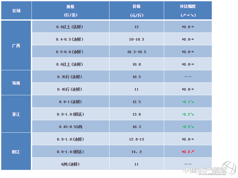 文/ 粵海飼料集團、中國水產頻道 彭曉君 中國水產頻道原創報道,廣西區域:欽州港陸續有養殖戶開始賣魚,目前整體養殖正常,小范圍地區發現有小瓜蟲;北海深水網箱魚規格在0.5斤/尾以上,魚排魚規格0.35-0.5斤/尾,魚吃料和生長正常。目前過冬魚存量少,新魚集中3-4兩為主,僅少部分頭魚達到5-6兩,小規格新魚開始少量上市。雖然正值禁海期,但市場消化疲軟,氣溫熱,魚腸炎等病害較多,加上小規格魚逐步開始上市,各規格冰鮮及活鮮價格均較為低迷。凍品價格持續低迷。具體報價:400/500克的9.5-9.75元/斤(平);500/600克的10-10.5元/斤(平);600/700克的10.5-11.0元/斤(平);700/800克的11.0-11.5元/斤(平)。 湛江區域:價格同比上周略有下跌。魚排、網箱金鯧規格0.4-0.5斤/尾,吃料增加,生長正常。 海南區域:大部分魚規格在0.2-0.45斤/尾,現在有部分客戶開始出魚。 陽江區域:魚排魚規格0.35-0.45斤/尾,吃料正常。 ※上述報價可能會因區域、規格、品質和時間等因素的不同而會產生差異,在此僅供參考。環比幅度以本周價格與上周價格數據做對比。 【關鍵字】:金鯧魚 金鯧魚價格 水產養殖 |