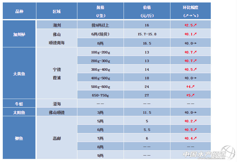 文/ 粵海飼料集團(tuán)、中國(guó)水產(chǎn)頻道 彭曉君 中國(guó)水產(chǎn)頻道原創(chuàng)報(bào)道,加州鱸:湖州區(qū)域加州鱸魚0.9斤/條以上,價(jià)格16元/斤,較上周價(jià)格上漲1元/斤,商品魚存塘量降低,魚價(jià)后期仍會(huì)上漲。佛山順德、南海區(qū)域加州鱸白嘴白尾,出血,爛身,爛嘴爛鰓,腸炎;大魚諾卡氏,花身,爛身。 大黃魚:寧德、霞浦區(qū)域魚排存魚量大,主要為2-8兩規(guī)格,小規(guī)格魚市場(chǎng)銷售緩慢。8兩以上大規(guī)格魚少,不足2%,大規(guī)格魚價(jià)格較好。本周小規(guī)格魚同比上周上漲0.5-0.7元/斤;大規(guī)格魚市場(chǎng)緊缺,本周漲幅較大,同比上周上漲4-5元/斤。 牛蛙:澄海區(qū)域牛蛙已全部抓完,新蛙未達(dá)上市規(guī)格。 鯽魚:高郵區(qū)域魚價(jià)開始上漲,鯽魚5兩5元/斤,6兩5.5元/斤,鯽魚7兩6元/斤,8、9兩規(guī)格的存塘魚基本無。 ※上述報(bào)價(jià)可能會(huì)因區(qū)域、規(guī)格、品質(zhì)和時(shí)間等因素的不同而會(huì)產(chǎn)生差異,在此僅供參考。環(huán)比幅度以本周價(jià)格與上周價(jià)格數(shù)據(jù)做對(duì)比。 【關(guān)鍵字】:加州鱸 太陽魚價(jià)格 水產(chǎn)養(yǎng)殖 |