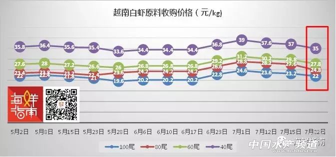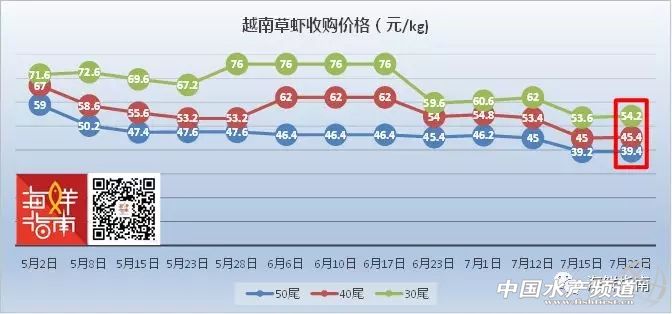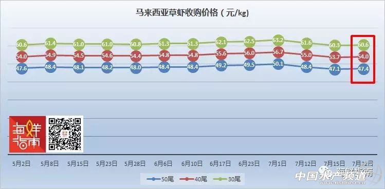 海外草蝦收購價格行情 本周,越南草蝦止跌小幅回升,50尾/公斤草蝦漲幅為0.2元/公斤,40尾/公斤漲幅為0.4元/公斤,30尾/公斤漲幅為0.6元/公斤。 5月2日至7月22日越南草蝦收購價格走勢(來源:海鮮指南) 相比之下,馬來西亞草蝦(虎蝦)價格更加穩定,30、40、50尾/公斤各規格漲幅均在0.3元左右,基本與上周持平。 溫馨提示: 以上價格行情由媒體“海鮮指南”“水產前沿”統計整理發布,僅供參考。市場有風險,交易需謹慎。 |