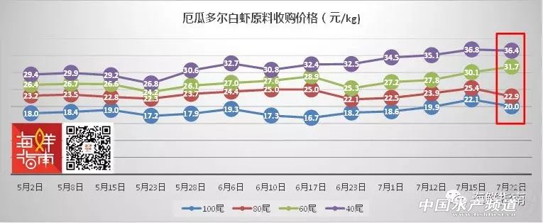 文/圖 海鮮指南(seafood-guide) 張麗麗、陳磊 海外白蝦原料收購價格 本周(2018年7月19日- 7月26日)全球白蝦主產區價格波動趨緩,印尼漲價幅度繼續領跑,馬來西亞、印度小幅上升,厄瓜多爾、泰國漲跌互現,越南繼續下跌。具體如下: 注:以上產品為當地蝦類的塘頭收購價,匯率當地貨幣實時兌換人民幣計算 越南白蝦價格已連續3周下跌,本周下滑明顯。與上周相比,100尾/公斤規格降幅為1.2元/公斤,80尾/公斤白蝦降幅為2.8元/公斤,60尾/公斤規格降幅為2元/公斤,40尾/公斤白蝦降幅為2元/公斤。 5月2日至7月22日越南白蝦原料收購價格走勢(來源:海鮮指南) 厄瓜多爾白蝦價格漲跌互現,波動劇烈。與上周相比,100尾/公斤規格降幅為2元/公斤,80尾/公斤白蝦降幅為2.5元/公斤,60尾/公斤規格已經連續4周回升,本周漲幅為1.6元/公斤,40尾/公斤白蝦降幅為0.4元/公斤。據業內人士消息,國內上周40/50、50/60規格的品牌白蝦現貨緊張,有些區域甚至沒貨。 5月2日至7月12日厄瓜多爾白蝦原料收購價格走勢(來源:海鮮指南) 泰國白蝦價格因規格而異。與上周相比,55-77尾/公斤的中等規格白蝦價格下跌明顯,降幅約1元/公斤,而80尾/公斤以下的小規格白蝦價格基本與上周持平,漲幅以<0.3元/公斤居多,主要為匯率影響。 注:以上產品為當地蝦類的塘頭收購價,匯率當泰銖:人民幣=0.2032:1計算 印度白蝦各規格均勻小幅上升。與上周相比,各規格漲幅為0.6元/公斤。 馬來西亞白蝦價格穩定,基本與上周持平。與上周相比,各規格蝦價穩定,漲幅微小僅為0.2元/公斤。 印尼白蝦漲幅相對放緩,但本周依然領跑。與上周相比,100尾/公斤白蝦價格漲幅為1元/公斤,80尾/公斤規格漲幅為0.5元/公斤,60尾/公斤規格漲幅為1.5元/公斤,40尾/公斤規格漲幅為0.5元/公斤。 本期新增國產白蝦塘頭價,詳情如下: 南方國產白對蝦塘頭價 臺風暴雨天氣影響,病蝦上市沖擊蝦價 華南主產區白蝦塘頭價 珠海、新會:本周蝦價30頭22-23元/斤,40頭20.5元/斤,50頭18-18.5元/斤,60頭15-15.5元/斤,暫時與上周基本持平。據了解,珠三角水產市場連續兩天爛市,預計有下滑趨勢,惡劣天氣因素影響最大。 中山:本周蝦價30頭(浸籠)23-24元/斤,40頭19-21元/斤,50頭17-19元/斤,中大規格蝦跌幅達3元/斤。近期惡劣天氣影響,時高溫時暴雨,極端天氣導致蝦塘多有應激發病現象,蝦塘發病趕出塘,蝦價不理想。 海南:本周蝦價30頭18.5-19元/斤,40頭16-17元/斤,50頭15.5元/斤,同比上周略漲0.5元/斤,波動不大。預計后期趨勢應該會持平走,大多為海南島內自銷,受臺風影響近一周內蝦供應有點緊張所以價格不會下降。 陽江:本周蝦價40頭16-17元/斤,50頭14-15元/斤,60頭12.5元/斤,同比上周下跌1-2.5元/斤。近期,因臺風暴雨天氣影響,養戶集中提前出蝦,臺風后病蝦增多,蝦價下跌,更有超低價40頭13元/斤左右,后期蝦價走向不明朗。 廣西:本周蝦價35頭21元/斤,40頭19元/斤,50頭16-17元/斤,60頭14元/斤,同比上周漲1-2元/斤。目前北海區域存塘量少,有7成空塘在清理;欽州區域因放苗遲,且因苗不好生長速度慢,導致這個階段存塘量較多,規格以30-45頭為主。預計,后期蝦價有上漲趨勢。 福建:本周蝦價30頭25-26元/斤,40頭23元/斤,50頭18-19元/斤,同比上周下跌1元/斤。本周,各個規格的蝦都集體降價,多數認為市場購買力不強,現在基本上收冰蝦。