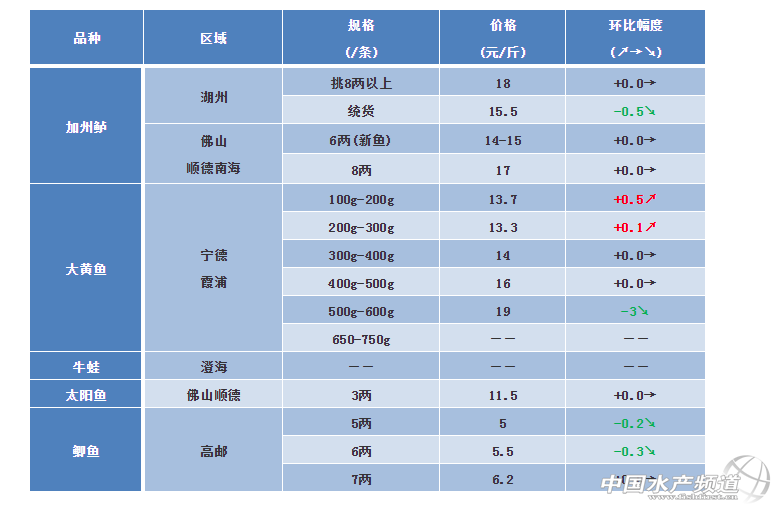文/ 粵海飼料集團、中國水產頻道 彭曉君 中國水產頻道原創報道,加州鱸:湖州區域由于老口鱸魚出魚接近尾聲,標魚價格穩定,統貨近期略有下降,后市魚價短期可能繼續小幅上漲。佛山順德、南海區域加州新魚6兩炮頭1.3-1.4斤15元。新魚出血,爛身,爛嘴爛鰓,腸炎,諾卡氏;加州舊魚諾卡氏,爛鰓,腸炎,虹彩病毒,爛身潰瘍。 大黃魚:寧德、霞浦區域魚排存魚量大,主要為2-8兩規格,小規格魚市場銷售緩慢;8兩以上大規格規格魚少,不足2%,大規格魚價格較好。本周大黃魚價格:小規格魚同比上周上漲0.2-0.3元/斤;大規格魚市場緊缺,價格稍有回落,同比上周下跌1-2元/斤。 牛蛙:澄海區域牛蛙已全部抓完,新蛙未達上市規格。 鯽魚:高郵區域基本沒有多少養戶出魚,除了密度較大的出魚。 ※上述報價可能會因區域、規格、品質和時間等因素的不同而會產生差異,在此僅供參考。環比幅度以本周價格與上周價格數據做對比。 【關鍵字】:加州鱸 大黃魚價格 水產養殖 |