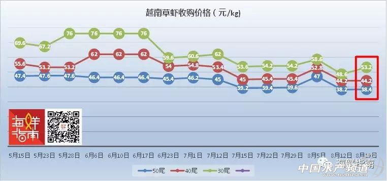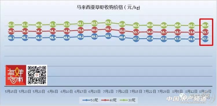 海外草蝦收購價格行情 本周,越南草蝦價格觸底反彈。其中,50尾/公斤草蝦漲幅為0.2元/公斤,40尾/公斤價格與上周持平,30尾/公斤漲幅達4.6元/公斤。 5月15日至8月19日越南草蝦收購價格走勢(來源:海鮮指南) 相比之下,馬來西亞草蝦(虎蝦)價格十分穩定,30、40、50尾/公斤各規格均與上周基本持平。 5月15日至8月19日馬來西亞草蝦收購價格走勢(來源:海鮮指南) |