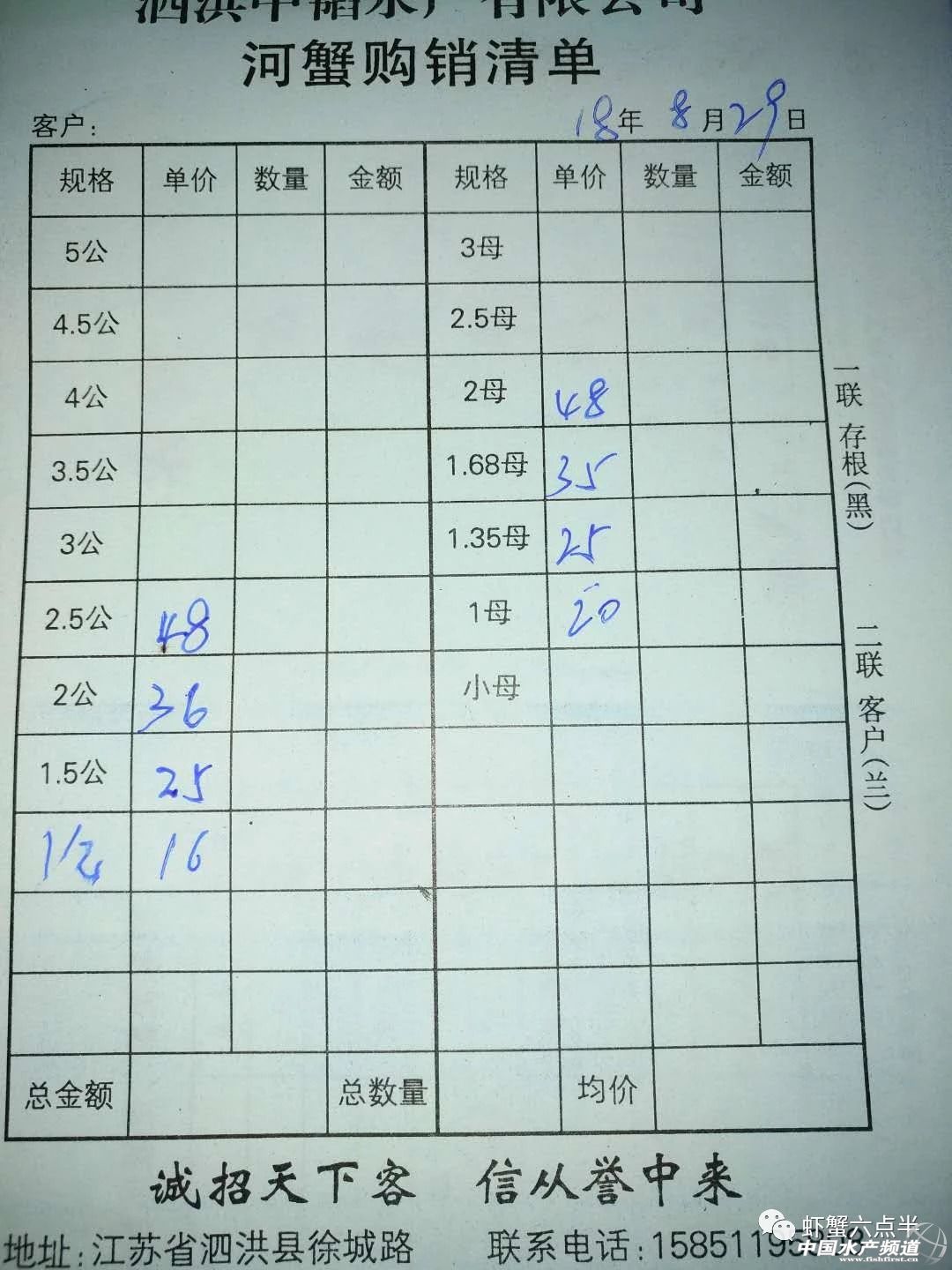 中國水產頻道報道, 報價是為了讓養殖戶能早點了解價格信息,根據行情盡量賣個好價錢。希望養殖戶朋友也能參與報價,提供價格信息,讓更多的人能更快更早的了解當天行情 2018.8.29 大閘蟹 六月黃 【關鍵字】:蝦蟹 價格 水產養殖 |
