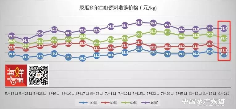 文/圖 海鮮指南(seafood-guide) 張麗麗、陳磊 海外白蝦原料收購價格 上周日(2018年9月2日)全球白蝦主產(chǎn)區(qū)原料價格波動劇烈,其中,越南、印度、印尼三地大規(guī)格蝦猛漲(40尾/公斤) ,其他規(guī)格也出現(xiàn)不同程度上漲,而厄瓜多爾、馬來西亞兩地蝦價卻在下跌。具體如下: 表1 2018年9月2日海外白蝦原料收購價格 注:以上產(chǎn)品為當(dāng)?shù)匚r類的塘頭收購價,匯率按當(dāng)?shù)刎泿艑崟r兌換人民幣計算 越南白蝦價格大幅上揚。與兩周前相比,9月2日60、80、100尾/公斤的越南白蝦漲幅為2.6-2.8元/公斤,大規(guī)格原料40尾/公斤的漲幅高達5.6元/公斤,自5月以來首次突破40元/公斤。 5月15日至9月2日越南白蝦原料收購價格走勢(來源:海鮮指南) 厄瓜多爾白蝦顯著回落。與兩周前相比,9月2日各規(guī)格多爾蝦出現(xiàn)不同程度下跌,100尾/公斤降幅為1.5元/公斤,80尾/公斤降幅為3.6元/公斤,60尾/公斤的降幅為2.3元/公斤,40尾/公斤降幅為0.2元/公斤,相對較小。 5月15日至9月2日厄瓜多爾白蝦原料收購價格走勢(來源:海鮮指南) 印度白蝦小幅回落。與兩周前相比,9月2日印度100尾/公斤小幅上漲0.5元/公斤,規(guī)格越大,上漲越明顯,80尾/公斤漲幅為2.7元/公斤,60尾/公斤漲幅為6.0元/公斤,40尾/公斤兩周漲幅高達7.8元/公斤,突破40元/公斤。 5月15日至9月2日印度白蝦原料收購價格走勢(來源:海鮮指南) 馬來西亞小幅下跌。與兩周前相比,馬來西亞自6月下旬以來蝦價一直穩(wěn)中有漲,但漲幅較小,多數(shù)漲幅在1.0元/公斤以內(nèi),偶有突破。9月2日首次出現(xiàn)全規(guī)格小幅下跌的情況,但下滑幅度不大,在0.5-0.7元/公斤范圍內(nèi)。即便如此,與其他國家橫向?qū)Ρ龋纫?guī)格下馬來西亞白蝦原料性價比依然不如其他產(chǎn)區(qū)高。 印尼大規(guī)格蝦大幅上漲,其他規(guī)格基本穩(wěn)定。與兩周前相比,9月2日印尼100尾/公斤白蝦小幅下跌,降幅為0.4元/公斤,其他規(guī)格均有上漲,80尾/公斤漲幅為0.2元/公斤,60尾/公斤漲幅為0.6元/公斤,40尾/公斤漲幅為5.2元/公斤,塘頭收購價接近40元/公斤。 9月5日國產(chǎn)白蝦塘頭價,詳情如下: 國產(chǎn)南方白對蝦 存塘量驟減,蝦價穩(wěn)中漲 華南主產(chǎn)區(qū)白蝦塘頭價 珠海、新會:本周蝦價40頭22元/斤,45頭19元/斤,50頭16.8元/斤,60頭15.5元/斤,70頭13.5元/斤,整體蝦價略有上漲,近期行情好轉(zhuǎn)。或因臺山、斗門水浸,魚蝦大逃,存塘量進一步縮減,市場好市,長途車補倉,紛紛抬價收蝦。近日,外地蝦價低,長途車開始向外抓蝦,本地蝦不多,蝦價后市穩(wěn)定為主。 海南:本周蝦價30頭22.5元/斤,40頭19元/斤,45頭17-17.5元/斤,50頭16元/斤,整體蝦價上漲0.5元/斤。大規(guī)格蝦存塘量少,有業(yè)者說道:整個海南都缺蝦!(中造剩余的大蝦) 陽江:本周蝦價20頭28元/斤,30頭25元/斤,40頭23元/斤,50頭21元/斤,60頭19元/斤,整體蝦價上漲2-4元/斤,前提活蝦質(zhì)量好,質(zhì)量差的低1-2元/斤。體色好、無空腸空胃、活力好,蝦的價格相對漲勢明顯。 廣西:本周蝦價30頭28-28.5元/斤,40頭23-24元/斤,蝦價稍有波動下跌。近期發(fā)病較多,白便、偷死現(xiàn)象普遍,30頭規(guī)格蝦要漂亮蝦色的才有高價30元/斤。 福建:本周蝦價30頭25元/斤,40頭20.5元/斤,50頭15.5元/斤,60頭13元/斤,整體蝦價下跌2-3元/斤。近期蝦價行情不好,蝦價持續(xù)下滑,預(yù)計到中秋節(jié)前會有所回升。養(yǎng)殖情況:前些天一直在下雨,近些天忽而高溫,外塘發(fā)病率較高。 表2 華南主產(chǎn)區(qū)白蝦塘頭價 華東地區(qū)白蝦塘頭價 浙江:本周蝦價30頭20-21元/斤,40頭19元/斤,50頭17元/斤,60頭15元/斤,整體活水蝦價格穩(wěn)中偏低價。由于臺風(fēng)天氣,雷陣雨頻繁,加之降溫溫差大,隨之病蝦上市量劇增,蝦價依然遭壓。冰鮮蝦價格:40頭15.5-16元/斤打樣。 江蘇:本周蝦價30頭21元/斤,40頭19元/斤,50頭17元/斤,60頭15元/斤,整體蝦價穩(wěn)定,略有波動下跌趨勢。目前中小規(guī)格蝦上市量大,春造蝦、秋造蝦集中出蝦,養(yǎng)殖發(fā)病情況普遍,基本為看蝦質(zhì)抬價。 表3 華東地區(qū)白蝦塘頭價 國產(chǎn)北方白對蝦 病蝦上市高峰,蝦價下滑 華北、東北地區(qū)白蝦塘頭價 河北:本周蝦價30頭19元/斤,35頭17元/斤,40頭16元/斤,唐山、黃驊地區(qū)多塘口提前半個多月出蝦,多為病蝦且規(guī)格不大,整體價格下滑1-2元/斤。冰蝦價格:30頭18元/斤,40頭16元/斤。 天津:寶坻、武清地區(qū)基本已清塘接近尾聲,其他地區(qū)-津南、大港仍少蝦出,上千畝望子塘目前正收尾。本周蝦價30頭19.5元/斤,40頭17元/斤,這種中小規(guī)格蝦價格不理想,河南、東北市場偏愛20頭大規(guī)格蝦。冰蝦價格:塘頭價30頭18.2-18.5元/斤,40頭16.2-16.5元/斤,隨著唐海蝦大量上市,冰蝦價格或受影響將下跌。 遼寧營口:本周蝦價20頭23元/斤,25頭20-20.5元/斤,30頭18元/斤,40頭14.5-15元/斤,整體蝦價下滑1元/斤,繼上周下跌后再下跌一波。塘口隨著養(yǎng)殖時間的延長產(chǎn)量大增,出蝦量大,目前處于出蝦高峰期,加之急于出塘的病蝦量也多,導(dǎo)致蝦價下滑。冰蝦價格:100頭7.5元/斤,返頭1毛錢/頭。 表4 華北、東北地區(qū)白蝦塘頭價 海外草蝦收購價格行情 與兩周前相比,越南草蝦價格平穩(wěn)。9月2日30、40、50尾/公斤各規(guī)格漲幅在0.2-0.4元/公斤范圍內(nèi)。 5月15日至9月2日越南草蝦收購價格走勢(來源:海鮮指南) 與兩周前相比,馬來