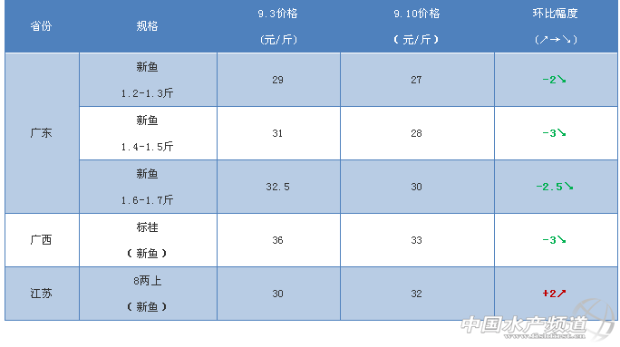 文/圖 何氏水產(chǎn) 水產(chǎn)前沿 李靜 1、廣東桂魚(yú)價(jià)格比上周同期下跌了2-3元/斤,主要原因是:1.9月份學(xué)生開(kāi)學(xué),消費(fèi)量下降,市場(chǎng)行情不好,銷(xiāo)量少;2.本地魚(yú)推出市場(chǎng),價(jià)格便宜,成活率高,占據(jù)一定市場(chǎng)份額;3.餌料魚(yú)貴,天氣不好,魚(yú)長(zhǎng)得慢,大魚(yú)頭數(shù)量不多。現(xiàn)在存塘量的新魚(yú)魚(yú)頭大部分都是1.2-1.3斤,1.7-1.8斤的魚(yú)頭很少,導(dǎo)致市場(chǎng)偏小規(guī)格的魚(yú)多,偏大規(guī)格緊缺。受白露、教師節(jié)、中秋節(jié)影響,桂魚(yú)市場(chǎng)行情好轉(zhuǎn),養(yǎng)戶惜售,預(yù)計(jì)偏大規(guī)格有一定上漲空間。 2、受到廣東新魚(yú)價(jià)格影響,廣西標(biāo)桂下跌了3元/斤。江蘇本地能上市的魚(yú)比較少,8兩以上新魚(yú)上漲了2元/斤。 各地區(qū)桂花魚(yú)出塘價(jià) 相關(guān)推薦 往期鱖魚(yú)價(jià)格行情 http://www.fuqitext.com/portal.php?mod=list&catid=53 【關(guān)鍵字】: 廣東鱖魚(yú) 水產(chǎn)養(yǎng)殖 |