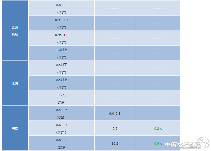 文/ 粵海飼料集團(tuán)、中國(guó)水產(chǎn)頻道 彭曉君 中國(guó)水產(chǎn)頻道原創(chuàng)獨(dú)家報(bào)道,廣西區(qū)域:欽州防城、北海地區(qū)由于受臺(tái)風(fēng)“山竹”影響,臺(tái)風(fēng)前搶收入凍庫(kù),價(jià)格凌亂,無(wú)法統(tǒng)計(jì)。目前早批苗頭魚(yú)已達(dá)1一斤,大部分魚(yú)棑都是6-8兩的魚(yú),客戶(hù)陸續(xù)抓緊出魚(yú),出魚(yú)規(guī)格以7兩以上為主,為降低風(fēng)險(xiǎn),今年較多的客戶(hù)選擇六兩左右就開(kāi)始出魚(yú),這樣可以縮短養(yǎng)殖周期、降低風(fēng)險(xiǎn)。由于近期臺(tái)風(fēng)臨近,客戶(hù)出魚(yú)比較集中,價(jià)格有所下跌。凍品(新魚(yú))200/30010元/斤(平);300/40011元/斤(平);400/50012元/斤(平)。 湛江區(qū)域:臺(tái)風(fēng)“山竹”登錄前搶收,價(jià)格下跌。 陽(yáng)江區(qū)域:本周魚(yú)價(jià)穩(wěn)定,養(yǎng)殖情況:部分魚(yú)有感染小瓜蟲(chóng)病害,魚(yú)吃料大幅減少。 ※上述報(bào)價(jià)可能會(huì)因區(qū)域、規(guī)格、品質(zhì)和時(shí)間等因素的不同而會(huì)產(chǎn)生差異,在此僅供參考。環(huán)比幅度以本周價(jià)格與上周價(jià)格數(shù)據(jù)做對(duì)比。 【關(guān)鍵字】:金鯧魚(yú) 金鯧魚(yú)價(jià)格 水產(chǎn)養(yǎng)殖 |