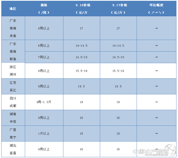 中國水產頻道報道,2018年9月17日加州鱸價格行情分析如下: 1、本周廣東鱸魚新老魚的價格與上周相比差不多,8兩以上老魚還是17元/斤,新魚6兩以上14-14.5元/斤,7兩以上14.5-15元/斤,8兩以上15.5元/斤,主要看魚頭以及8兩以上的比例來定價,F在老魚主要剩下沙頭產區的幾十塘了,到月底的出魚計劃基本上都已安排好,每天出魚量不大。現在主要是出新魚為主,本周末就上中秋節的量了,屆時銷量會比現在多,由于現在新老魚的存塘量還能滿足市場需求,預測接下來價格還會持穩。 2、浙江湖州與江蘇吳江現在老魚存塘量越來越少了,偏大魚頭還是不多,浙江湖州現在主要出統貨為主,本地有部分零星一兩塘新魚推出市場。江蘇吳江從上周開始價格下跌了0.5元/斤,本周價格持穩,新魚最快10月初才能上市。這兩地本周末因為也是上中秋節的貨量,銷量會比上周多。其他區域的鱸魚價格與上周一致,本地存塘量都不多,出魚量也不大。 各地區加州鱸出塘價 |