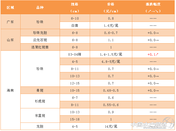 文/ 水產(chǎn)前沿 吳佳輝 石斑魚 海南:海南由于氣候問題,出過龍膽的養(yǎng)殖區(qū)都出現(xiàn)不同程度的損耗,導(dǎo)致養(yǎng)殖戶不敢抓魚。 石斑魚苗 廣東:6-10公分的石斑魚苗,價(jià)格在0.8元/cm,白苗0.3的1.6元/尾,市場上的白苗較少。9月開始陸陸續(xù)續(xù)有客戶投放珍珠苗卵,但由于2個(gè)臺風(fēng)接踵而至,導(dǎo)致放卵成功率低。 特別感謝:海南晨海水產(chǎn)有限公司、海南大順發(fā)水產(chǎn)有限公司、萊州明波水產(chǎn)有限公司、廣東上上生物科技有限公司為本文提供價(jià)格! |