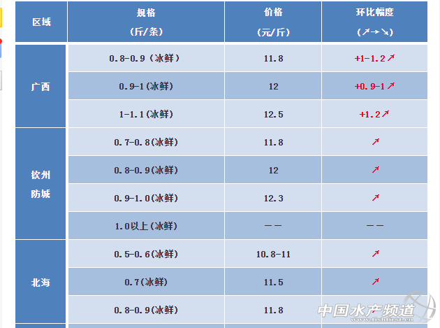 中國水產頻道原創報道, 文/ 水產前沿 彭曉君 金鯧魚 廣西區域:目前早批苗頭魚已達1斤以上,大部分魚棑都是7-8兩規格的魚,養戶陸續抓緊出魚,出魚規格以8兩以上為主。今年較多的養戶選擇六兩左右就開始出魚,這樣可以縮短養殖周期、降低風險。臺風過后魚價上漲1元左右,中秋節慶及國慶臨近,養戶大多看好魚價上漲而惜售,期待漲更高,真正成交量較少,估計國慶前會迎來出魚高峰。凍品(新魚)200/300 10元/斤(平);300/400的 11元/斤(平);400/500 12元/斤(平)。臺風過后漲價明顯,養殖戶惜售,欽防地區存排魚不多。北海區域在臺風后漲價1.5元/斤以上。近期北海區域有價無市,大部分養殖戶無出魚計劃,因為9月16日“山竹”臺風來臨前抓了部分魚到凍廠。 海南區域:價格上漲,現在大部分養殖戶都惜售,出魚量較少。 湛江區域:價格略有上漲。魚排、網箱魚規格在0.65-0.9斤/條,個別海域網箱養殖有腸炎死魚現象。 陽江區域:臺風過后,魚吃料開始恢復正常,漲價1元/斤以上。 【關鍵字】:金鯧魚 塘頭價 水產養殖 |