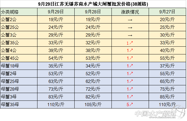 中國水產頻道整理報道,2018年9月29日江蘇無錫蘇南水產城河蟹批發價格穩中有漲,江蘇泗洪縣半城鎮大閘蟹收購價格明顯下跌,安徽當涂塘南水產市場河蟹收購價格大幅下跌,湖南益陽南縣大通湖大閘蟹批發價格穩中有跌,具體如下: 今日江蘇常州凌家塘水產市場大閘蟹批發價格與27日相比均下跌:其中, 公蟹:2公、25公、35公、4公、45公價格均下跌2元/斤,3公的價格下跌3元/斤。 母蟹:18母和25母的價格下跌2元/斤,2母的價格均下跌4元/斤,28母和3母的價格均下跌3元/斤,35母的價格下跌10元/斤,價格為100元/斤。 今日江蘇無錫蘇南水產城河蟹批發價格穩中有漲: 公蟹:2公、25公、3公的價格均保持不變,35公、4公和45公的價格均上漲1元/斤。 母蟹:18母、2母、25母、28母、3母的價格均上漲1元/斤,35母的上漲5元/斤,價格為110元/斤。 今日江蘇泗洪縣半城鎮大閘蟹收購價格下跌明顯: 公蟹:35公和3公的價格均下跌5元/斤,25公的價格下跌3元/斤,2公和15公的價格均下跌4元/斤。 母蟹:2母的價格下跌9元/斤,168母的價格下跌5元/斤、135母的價格下跌4元/斤,1母的價格下跌2元/斤。 今日安徽當涂塘南水產市場河蟹收購價格大幅下跌: 公蟹:5公的價格為80元/斤,45公的價格下跌13元/斤,4公的價格下跌8元/斤,35公和25公的價格均下跌4元/斤,3公的價格下跌3元/斤; 母蟹:35母的價格為110元/斤,3母、28母、25母和2母的價格均下跌5元/斤,15母的價格下跌2元/斤。 今日湖南益陽南縣大通湖大閘蟹批發價格較昨日相比穩中有跌 : 公蟹:3公、35公和4公的價格均保持不變,45公的價格大幅下跌,下跌了 20元/斤; 母蟹:1.3-1.7兩 母蟹的價格保持不變,2母和25母的價格下跌3元 /斤,28母 的價格下跌10元/斤,3母的價格下跌5元/斤,35母的價格下跌12元/斤,價格為98元/斤。 數據來源于中國水產養殖網 |