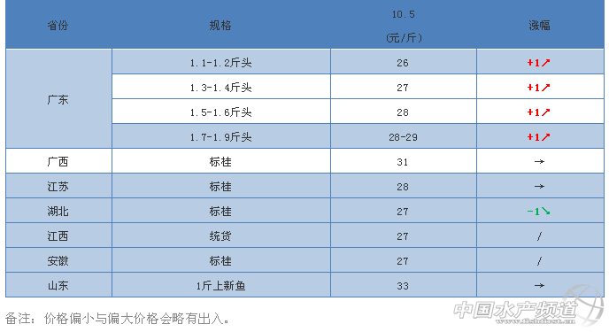 文/圖 水產前沿 李靜 鱖魚行情簡析 與往年國慶節尾聲鱖魚價格大幅下跌不同,今年國慶節后廣東鱖魚價格意外表現出穩中有升,這讓不少人感到意外。從昨天到今天,廣東鱖魚各規格訂魚價格均上漲了1元/斤左右,且接下來還有望保持穩定或會有一定上漲空間。 據廣東本地流通商反映,國慶節前鱖魚養殖戶集中大量出魚,而節后隨著天氣轉涼,養殖戶出魚積極性下降,再加上今年鱖魚養殖量減少,導致目前可以上市的鱖魚數量不多,流通商到處找魚,所以價格短期內會保持穩中有升。 本周廣西標桂價格暫時穩定,預計后天開始可能會跌1元/斤;湖北近期新魚上市數量增多,跌了1元/斤;江蘇、江西、安徽、山東標桂價格比較穩定,出魚量也不大。 各地鱖魚今日塘頭價 各地餌料魚行情簡析 本周,廣東餌料魚價格在近兩個月的持續上漲后迎來了第一輪全線下跌,且跌幅非常明顯。這與國慶節前廣東鱖魚大量出魚有一定關系,且今年廣東鱖魚存量比去年同期要少一些,另外經過近兩個月的飆升后餌料魚價格已超出鱖魚養戶心理預期,再加上近期一些草魚塘混養的鯪魚大量上市,預計短期內餌料魚價格或穩中有降。 各地區餌料魚今日塘頭價 |