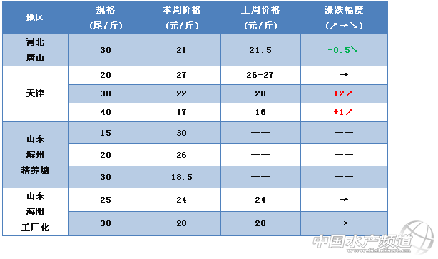 文/水產前沿 植銀素 本周行情 本周南方地區遭受降溫+雨水雙重打擊,天氣轉冷,對蝦吃料、活力都有影響,經常一天只喂一餐。存塘量即將“見底”,市場按需為主,大部分地區價格下滑。北方地區外塘蝦質量和整齊度欠佳,影響價格。預計月底前出蝦結束,價格暫穩。大蝦稀缺,天津地區漲幅明顯。山東工廠化病害較多,價格不理想,出蝦少。 今天,是一年一度的重陽佳節。在北方大部地區已進入寒冷的冬季。今天起,江南、華南北部雨水都將退去,只是在華南南部有小到中雨,另外海南東部局地可能有大到暴雨。今明天,南方降雨短暫停歇,江南部分地區可見陽光。18日夜間起,新一輪降雨又將上線。 據中央氣象臺中期預報,18至22日,中東部大部地區將自西向東出現小到中雨天氣,其中江南中西部、華南北部有大雨,局地暴雨。 分析與價格 華南地區 江門:今日蝦價33頭23元/斤,50頭18元/斤,蝦存塘量出一批少一批,本周價格對比上周小幅度下滑。 中山:40頭24元/斤;50條頭21元/斤;目前存塘大規格蝦偏少,目前存塘量出一塘少一塘,后市價錢預估會逐漸穩中有升。 陽江(土塘):30頭29元/斤,40頭24元/斤,50頭21元/斤,60頭17元/斤。大蝦供應少,價格高,新一輪病害開始,偷死和紅體病嚴重,蝦吃料少。 海南:今日蝦價20頭25.2元/斤;30頭18.3元/斤。本周海南蝦價再次出現小幅下滑,對蝦高發紅體病。 廣西:今日蝦價30頭25元/斤,40頭21元/斤,50頭20元/斤。本周蝦價下跌明顯,主要原因是發病多,成品蝦質量差,總體價格下降2-3元。 福建:今日蝦價30頭25元/斤,40頭21元/斤,50頭18元/斤,60頭16元/斤;東山地區混養池蝦價30頭24-25元/斤,40頭18-19元/斤,50頭15元/斤。據報價人所說,目前已經很少出蝦,清一塘少一塘,價格波動不大。 華東地區 浙江蕭山:今日蝦價12頭31.5元/斤,20頭23元/斤,22頭21.4元/斤,50頭20-21元/斤。本周大規格蝦價格總體表現不錯,12-13頭沖破30元大關。冰蝦:40頭17.5元/斤(打樣)。 北方地區 河北:今日蝦價(活蝦)30頭21元/斤,存塘量不足。 天津:今日蝦價20頭27元/斤,30頭22元/斤,40頭17元/斤,本周蝦價總體穩中有漲,存塘量少,大蝦稀缺。 山東:海陽:今日蝦價(工廠化)25頭24元/斤,30頭20元/斤。海陽地區蝦價與上周持平,最近蝦價不理想,養戶出蝦較少,規格多在20頭左右。濱州地區(精養塘):15頭30元/斤,20頭26元/斤,26頭22元/斤,30頭18.5元/斤,外塘蝦基本出完。 遼寧營口:土塘已經基本沒蝦了,工廠化養蝦到12月-2月份出蝦,暫停報價。 |