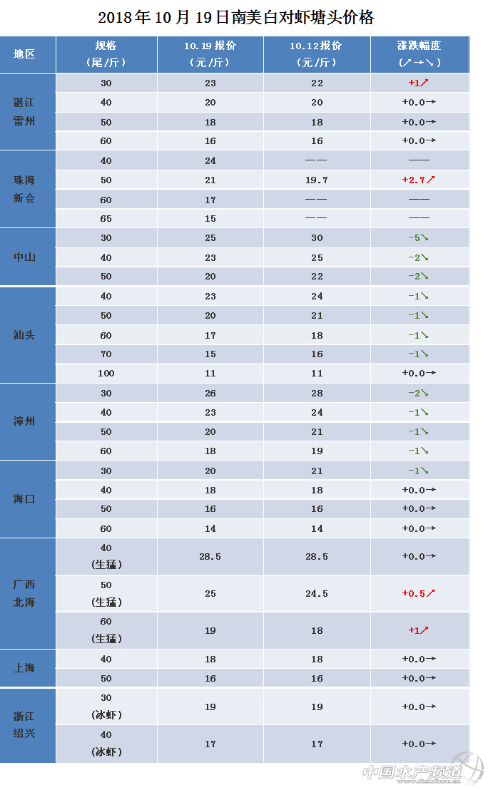 文/ 水產前沿 植銀素 各產區白對蝦一周價格分析 湛江雷州:30頭23元/斤,40頭20元/斤,50頭18元,60頭16元/斤;本周蝦價基本持平,市場需求強勁,看好后續上漲,今年冷空氣南下偏早,部分發病,預計蝦價還有少許上升空間,后續看漲。 海南海口:30頭21元/斤,40頭18元/斤,50頭16元,60頭15元/斤;本周蝦價基本持平,市場需求強勁,看好后續上漲,今年冷空氣南下偏早,部分發病,預計蝦價還有少許上升空間,后續看漲。 中山區域:30頭25元/斤;40頭23元/斤;50條頭20元/斤;白蝦白水塘夠規格蝦斷斷續續上市,出一塘少一塘,目前存塘量較少,但并不推動蝦價的上升。同時由于天氣的轉涼,白水塘吃料大量減少,部分蝦出現了一定的應激;冬棚已經陸續開始打棚蝦,以及投苗,同時終端也陸續開始蓋膠紙,進行冬棚的養殖。 珠海新會:40頭24元/斤,50頭21元/斤,60頭17元/斤,65頭15元/斤。進入搭冬棚季,大蝦存塘量持續減少,出塘少塘,消費量也不高,預計下周價格以穩定為主。 廣西北海:本周蝦價40頭28.5元/斤,50頭25元/斤,60頭19元/斤。目前大規格蝦存塘少,國慶前后大規格蝦基本已出完,冬棚蝦準備開始投苗。各規格蝦價格依然堅挺,本周50條規格上漲0.5元/斤,60條規格上漲1元/斤。 汕頭區域:本周蝦價40頭23元/斤,50頭20元/斤,60頭17元/斤,70頭15元/斤,100頭11元/斤。高位池無存塘大規格蝦,大多放苗一個月內。土塘蝦大量出蝦,由于病害較嚴重,蝦產量低,養殖池塘主要規格在30-100條。本周蝦價同比上周下跌1-2元/斤。 漳州區域:本周蝦價30頭26元/斤,40頭23元/斤,50頭20元/斤,60頭18元/斤。高位池無存塘大規格蝦,50%以上蝦為剛放苗一個月內;市場上主要銷售蝦為土塘蝦,存塘規格蝦在30-80條;大規格蝦存塘量減少,市場同比上周下跌1-2元/斤。 上海地區:本周蝦價40頭18元/斤,50頭16元/斤。近期價格下降,國慶節之后,市場需求周期性減弱,價格暫時下降,預計后期會緩慢上升。 浙江紹興:本周蝦價(冰蝦)30頭19元/斤,40頭17元/斤。紹興近期依然以出冰蝦為主,活水蝦較少,價格比較上周穩定,總體穩定。 江蘇如東:今年小棚蝦病害嚴重,現在最高70頭左右,估計月底開賣。 |