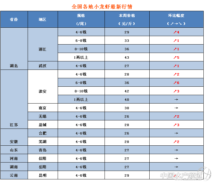 文/ 水產(chǎn)前沿 鄭鵬飛 一周資訊 1.本周小龍蝦的行情出現(xiàn)明顯上漲趨勢(shì)。據(jù)最新了解,很多地區(qū)的小龍蝦市場(chǎng)批發(fā)價(jià)格從19日開始到目前為止出現(xiàn)了連續(xù)4天的上漲,一周當(dāng)中最大漲幅達(dá)到6元/斤。 2.目前,湖北地區(qū)對(duì)于小龍蝦養(yǎng)殖的推廣力度再次加大,并出臺(tái)三大舉措。計(jì)劃要新建一批蝦稻共作、稻漁種養(yǎng)模式的百畝示范點(diǎn)、千畝示范片、萬(wàn)畝示范區(qū)和國(guó)家級(jí)示范縣。同時(shí)要加快良種培育,目標(biāo)在2020年推廣2-5個(gè)蝦稻共作、稻漁種養(yǎng)模式專用稻種和小龍蝦良種。計(jì)劃建設(shè)10個(gè)以上小龍蝦稻田生態(tài)繁育基地和一批小龍蝦良種場(chǎng)。同時(shí),目標(biāo)在2020年讓全省蝦稻共作、稻漁種養(yǎng)綜合產(chǎn)值達(dá)到1500億,讓銷售網(wǎng)路覆蓋全國(guó),電子商務(wù)年銷售額超過(guò)10億。 一周行情 從最新市場(chǎng)了解到的情況來(lái)看,本周小龍整體行情出現(xiàn)了一波上漲。從19日開始,大部分地區(qū)都開始出現(xiàn)上漲,到目前為止部分地區(qū)出現(xiàn)4天連續(xù)上漲,最高漲幅達(dá)到6元/斤。一般每年大閘蟹集中上市時(shí)間在9-11月,大閘蟹上市小龍蝦行情就會(huì)開始下滑。從最近大閘蟹價(jià)格的下滑可以感受到其消費(fèi)熱度的降低,而小龍蝦的行情也出現(xiàn)回暖,近期小龍蝦上漲的趨勢(shì)比較明顯。 |