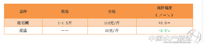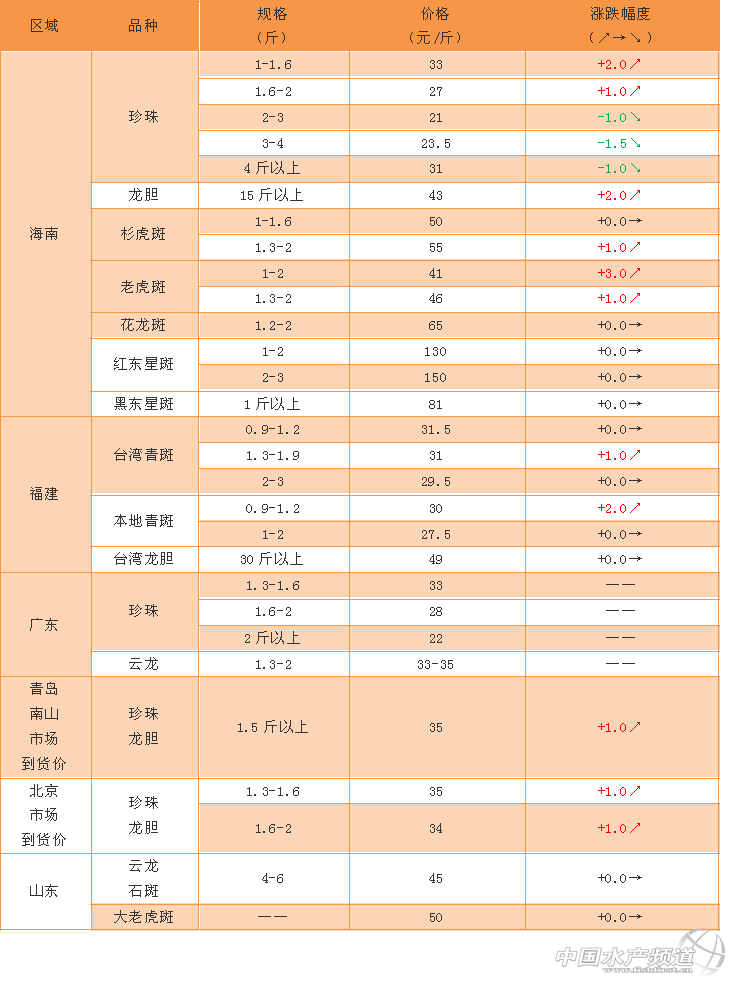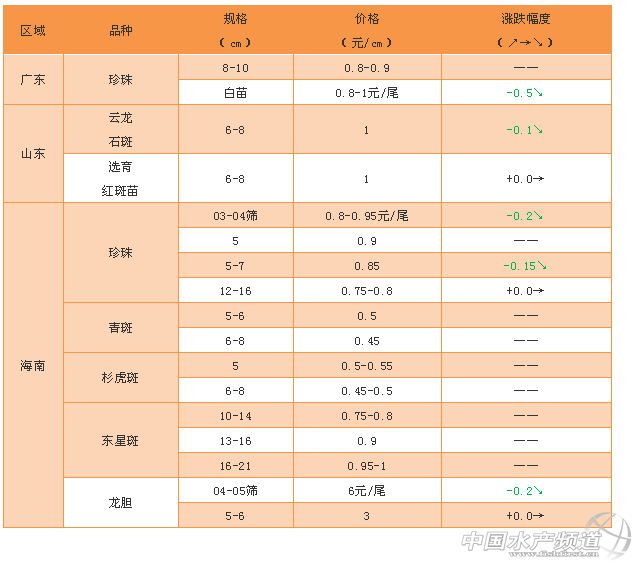 文/ 水產前沿 吳佳輝 石斑商品魚 海南:小珍珠、杉虎斑、老虎斑價格都略有上漲。小規格珍珠龍膽價格上漲的原因有兩個,第一個是小珍珠的存塘量減少;第二個原因是部分養殖戶想等到1-2斤之間以抓統貨的價格出售,所以目前繼續養殖,不愿出塘。 廣東:規格在1.3-1.6斤的珍珠價格有所上漲,規格魚價格繼續看漲! 石斑魚苗 廣東:白苗,中苗價格有所下降。 斑石鯛·泥猛 特別感謝:海南晨海水產有限公司、海南大順發水產有限公司、萊州明波水產有限公司、廣東上上生物科技有限公司為本文提供價格! 【關鍵字】: 珍珠 杉虎斑 老虎斑價格 石斑魚價格 水產養殖 |