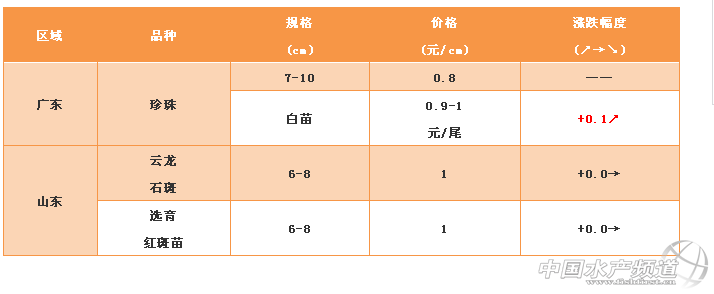 文/ 水產前沿 吳佳輝 石斑商品魚 海南:小珍珠、杉虎斑、老虎斑價格繼續上漲。小規格珍珠龍膽價格上漲的原因有兩個,第一個是小珍珠的存塘量減少;第二個原因是部分養殖戶想等到1-2斤之間以抓統貨的價格出售,所以目前繼續養殖,不愿出塘。 廣東:湛江一帶主要養殖龍膽和珍珠,基本上價格都比海南高1元/斤。規格魚價格看漲,2斤以上的魚由于需求少而存塘量大,比較難銷售。 石斑魚苗 特別感謝:海南晨海水產有限公司、海南大順發水產有限公司、萊州明波水產有限公司、廣東上上生物科技有限公司、廣東大順發水產有限公司為本文提供價格! |