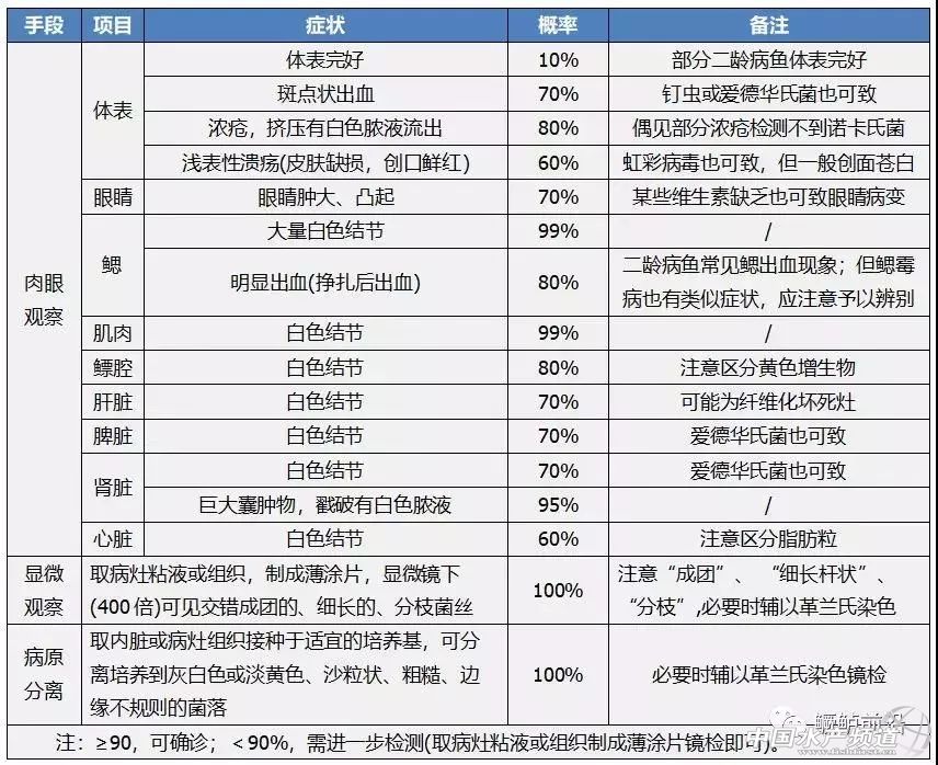 文/圖 順德活寶源生物科技有限公司 梁芝源 胡雄 王婷婷 一、病原—鰤魚諾卡氏菌 能侵害魚類的諾卡氏菌主要有3種,分別為星狀諾卡氏菌(N.asteroides)、鰤魚諾卡氏菌(N.seriolae)和殺鮭諾卡氏菌(N.salmonicida)。但據(jù)相關(guān)文獻(xiàn)和我們的檢測,從珠三角地區(qū)養(yǎng)殖加州鱸分離到的所有諾卡氏菌均為鰤魚諾卡氏菌(N.seriolae)。 1、革蘭氏陽性菌,適溫25——28℃ 鰤魚諾卡氏菌,為一種革蘭氏陽性菌,隸屬細(xì)菌屆、放線菌門、放線菌綱、放線菌目、諾卡氏菌科。該菌以腐生為主,專性需氧,具有弱抗酸性,無運(yùn)動(dòng)性,最適溫度25——28℃,最適鹽度0——1.0%,適宜pH范圍5.8——8.5,最適pH為6.5——7.0。 2、菌絲呈分枝桿狀,血平板中生長快 鰤魚諾卡氏菌的菌絲呈桿狀、分枝,長約2——5μm,在宿主病灶處相互交錯(cuò)、聚集成團(tuán)(光學(xué)顯微鏡放大400倍清晰可見)。該菌能在血瓊脂平板、營養(yǎng)瓊脂培養(yǎng)基、腦心浸液瓊脂培養(yǎng)基等多種培養(yǎng)基中生長,其中,在血平板中生長相對(duì)較快,2——5天即可長出明顯菌落;而在腦心浸液瓊脂培養(yǎng)基生長較慢,需4——10天才能長出明顯菌落;菌落呈白色或淡黃色,砂粒狀,粗糙,邊緣不整齊,有時(shí)表面凸起形成褶皺。 3、對(duì)氟苯尼考、強(qiáng)力霉素等相對(duì)敏感 據(jù)相關(guān)研究,鰤魚諾卡氏菌具有多種表型和基因型,其分型與地域差異與宿主關(guān)系不大。Ismail等研究發(fā)現(xiàn),α-葡萄糖苷酶陽性菌株對(duì)鹽酸土霉素有抗性,對(duì)紅霉素敏感;而α-葡萄糖苷酶陰性菌株對(duì)鹽酸土霉素敏感,絕大部分(97.9%)對(duì)紅霉素有抗性。據(jù)我們實(shí)驗(yàn)室內(nèi)部試驗(yàn),分離到的菌株均對(duì)氟苯尼考、強(qiáng)力霉素等相對(duì)敏感。 二、流行特點(diǎn) 1、4——11月份流行,15——32℃均可發(fā)病 從發(fā)病季節(jié)看,珠三角地區(qū)每年4——11月流行,水溫15——32℃均可發(fā)病。其中,一齡魚以10——11月份發(fā)病最為嚴(yán)重,二齡魚以4——5月份最為嚴(yán)重;其他月份(12月——次年2月),諾卡氏菌病為潛伏狀態(tài),一般不會(huì)發(fā)病死魚,但如果氣溫持續(xù)偏暖,也可引起持續(xù)少量死魚。 2、規(guī)格大于22cm易發(fā)病 從發(fā)病規(guī)格看,經(jīng)我們確診的、自然感染諾卡氏菌病的加州鱸最小規(guī)格為全長22cm。大于此規(guī)格的加州鱸,均易感染諾卡氏菌病;而小于此規(guī)格的加州鱸,盡管也有部分病魚會(huì)出現(xiàn)類似諾卡氏菌病的常見癥狀如肝臟白斑等,但此類病魚觀察不到疑似諾卡氏菌菌絲,也分離、培養(yǎng)不到疑似致病菌。 3、殺蟲、換水后發(fā)病率高,易復(fù)發(fā) 從發(fā)病規(guī)律看,在流行季節(jié),易感規(guī)格的加州鱸均可發(fā)病,在殺蟲、換水、過度投喂等節(jié)點(diǎn)后發(fā)病率極高。一旦發(fā)病,即使徹底治愈,也容易復(fù)發(fā);而且,一旦當(dāng)年發(fā)病,如果不徹底清塘,來年也發(fā)病的概率超過90%。 三、病癥 據(jù)相關(guān)文獻(xiàn),鰤魚諾卡氏菌病的主要病理變化為內(nèi)臟形成黃色或白色結(jié)節(jié)。但是,據(jù)我們檢測,諾卡氏菌病表現(xiàn)的癥狀十分復(fù)雜,不斷有新的病癥出現(xiàn)(如淺表性潰瘍,創(chuàng)口鮮紅);另一方面,也有一些疾病表現(xiàn)出與諾卡氏菌病類似的癥狀(如苗期肝臟白斑等)。 1、活動(dòng)狀態(tài):病魚常見體色偏黑,遲鈍,乏力,浮游于水面。但也有部分病魚活力較強(qiáng)。 2、體表:病魚體表常形成斑點(diǎn)狀出血,濃瘡,或者淺表性潰爛(患處鮮紅)。有時(shí)體表完好,并無異常。 3、口腔:少數(shù)病魚口腔可見潰瘍斑。 4、眼睛:部分嚴(yán)重感染的病魚可見眼睛膨大凸起。 5、鰓:部分病魚鰓絲有大量白色結(jié)節(jié),尤以秋冬季常見;但也有部分病魚鰓絲鮮紅,并無異樣。 6、肌肉:部分病魚肌肉有白色結(jié)節(jié)。 7、內(nèi)臟:部分病魚有大量腹水;多數(shù)病魚的肝臟、脾臟、腎臟、心臟、鰾腔表面等有白色結(jié)節(jié),部分病魚腸系膜也有白色結(jié)節(jié);部分病魚在后腎處形成巨大的囊腫物。 四、診斷要點(diǎn) 正確診斷諾卡氏菌病,就要對(duì)諾卡氏菌病的癥狀有深刻、全面的認(rèn)識(shí),并能靈活應(yīng)用光學(xué)顯微鏡,必要時(shí)借助實(shí)驗(yàn)室設(shè)備。 需要指出,隨著養(yǎng)殖環(huán)境的日益惡化以及盲目用藥,加州鱸諾卡氏菌病出現(xiàn)越來越多的新癥狀,在一線診斷時(shí),應(yīng)仔細(xì)、全面觀察病癥,并結(jié)合顯微鏡觀察情況綜合診斷,必要時(shí)聯(lián)系實(shí)驗(yàn)室協(xié)助確診。 此外,朝苗階段應(yīng)注意肝臟白斑與諾卡氏菌病白色結(jié)節(jié)的區(qū)別: 1、前者僅限于肝臟,內(nèi)臟分離培養(yǎng)不到致病菌; 2、后者癥狀較多,結(jié)節(jié)分布廣泛,內(nèi)臟可分離培養(yǎng)到諾卡氏菌。 養(yǎng)殖中后期注意愛德華氏菌病與諾卡氏菌病的區(qū)別: 1、前者結(jié)節(jié)僅限于脾臟,腎臟常見整體腫大,鏡檢有時(shí)也可見結(jié)節(jié),致病菌在腦心浸液培養(yǎng)基上生長相對(duì)較快,圓形,濕潤,邊緣整齊; 2、后者結(jié)節(jié)分布廣泛,致病菌在腦心浸液培養(yǎng)基上生長緩慢,沙粒狀,粗糙,鏡檢呈山丘狀,邊緣不規(guī)則。 五、預(yù)防方法 廣義上,可借鑒魚病的