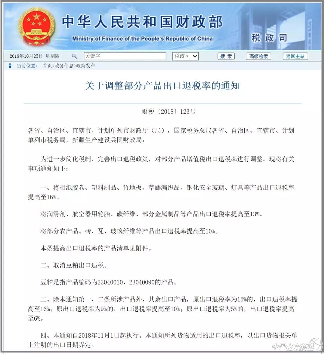 中國水產頻道原創報道, 綜合/ 海鮮指南(seafood-guide)張麗麗 據財政部網站25日消息,財政部近日印發關于調整部分產品出口退稅率的通知。通知明確指出,為進一步簡化稅制、完善出口退稅政策,對部分產品增值稅出口退稅率進行調整。 本次詳細通知如下: 公告通知 關于調整部分產品出口退稅率的通知 財稅〔2018〕123號 各省、自治區、直轄市、計劃單列市財政廳(局),國家稅務總局各省、自治區、直轄市、計劃單列市稅務局,新疆生產建設兵團財政局: 為進一步簡化稅制、完善出口退稅政策,對部分產品增值稅出口退稅率進行調整。現將有關事項通知如下: 一、將相紙膠卷、塑料制品、竹地板、草藤編織品、鋼化安全玻璃、燈具等產品出口退稅率提高至16%。 將潤滑劑、航空器用輪胎、碳纖維、部分金屬制品等產品出口退稅率提高至13%。 將部分農產品、磚、瓦、玻璃纖維等產品出口退稅率提高至10%。 本條提高出口退稅率的產品清單見附件。 二、取消豆粕出口退稅。 豆粕是指產品編碼為23040010、23040090的產品。 三、除本通知第一、二條所涉產品外,其余出口產品,原出口退稅率為15%的,出口退稅率提高至16%;原出口退稅率為9%的,出口退稅率提高至10%;原出口退稅率為5%的,出口退稅率提高至6%。 四、本通知自2018年11月1日起執行。本通知所列貨物適用的出口退稅率,以出口貨物報關單上注明的出口日期界定。 附件:提高出口退稅率的產品清單 財政部 稅務總局 2018年10月22日 通知明確,自2018年11月1日起執行。本通知所列貨物適用的出口退稅率,以出口貨物報關單上注明的出口日期界定。 根據通知,有4點需要注意的: 1. 部分列明的出口產品退稅率提高幅度較大。 2. 其余未列明的出口產品退稅率都提高1%。 3. 自2018年11月1日起執行。 4. 以出口報關單上注明出口日期界定。 出口退稅率提高的產品清單下載地址: http://szs.mof.gov.cn/zhengwuxinxi/zhengcefabu/201810/t20181019_3050975.html 海鮮指南查閱清單,本次提高出口退稅清單涉及的水海產品種很多,如鱒魚、大麻哈魚、鮭魚、鰈鲆魚、比目魚、金槍魚、鱈魚、羅非魚、鰻魚、鯰魚、鯉科魚、扇貝、生蠔、海膽、海參等。詳見下表: 提高出口退稅率的產品清單 (部分節選) 序號 產品編碼 產品名稱 調整后退稅率 (%) 1 02032900101 除分割野豬肉以外的凍藏野豬其他肉 10 2 02032900901 除分割豬肉以外的其他凍藏豬肉 10 3 02061000 鮮或冷藏的牛雜碎 10 4 02081010001 除分割家兔肉以外的鮮或冷的家兔肉 10 5 02081020001 除分割家兔肉以外的凍家兔肉 10 6 0208109090 鮮、冷或凍家兔食用雜碎 10 7 0208909090 其他鮮、冷或凍肉及食用雜碎 10 8 02101900 干、熏、鹽制的其他豬肉 10 9 0301190090 其他觀賞用非淡水魚 10 10 03019110 鱒魚(河鱒、虹鱒、克拉克大麻哈魚、阿瓜大麻哈魚、吉雨大麻哈魚、亞利桑那大麻哈魚、金腹大麻哈魚)的魚苗 10 11 03019190 其他活鱒魚(河鱒、虹鱒、克拉克大麻哈魚、阿瓜大麻哈魚、吉雨大麻哈魚、亞利桑那大麻哈魚、金腹大麻哈魚) 10 12 03019290 其他活鰻魚 10 13 03019310 鯉科魚(鯉屬、鯽屬、草魚、鰱屬、鯪屬、青魚、卡特拉鲃、野鯪屬、哈氏紋唇魚、何氏細須鲃、魴屬)魚苗 10 14 03019390 其他鯉科魚(鯉屬、鯽屬、草魚、鰱屬、鯪屬、青魚、卡特拉鲃、野鯪屬、哈氏紋唇魚、何氏細須鲃、魴屬) 10 15 03019410 大西洋及太平洋藍鰭金槍魚魚苗 10 16 03019491 大西洋藍鰭金槍魚 10 17 03019492 太平洋藍鰭金槍魚 10 18 03019510 南方藍鰭金槍魚(Thunnusmaccoyii)苗 10 19 03019590 其他南方藍鰭金槍魚(Thunnusmaccoyii) 10 20 03019911 鱸魚種苗 10 21 03019912 鱘魚種苗 10 22 0301991990 其他魚苗 10 23 03019991 活羅非魚 10 24 03019992 活的鲀 10 25 0301999390 活的其他鯉科魚 10 26 0301999990 其他活魚 10 27 03021100 鮮或冷鱒魚(河鱒、虹鱒、克拉克大麻哈魚、阿瓜大麻哈魚、吉雨大麻哈魚、亞利桑那大麻哈魚、金腹大麻哈魚) 10 28 03021300 鮮或冷的大麻哈魚〔紅大麻哈魚、細磷大麻哈魚、大麻哈魚(種)、大鱗大麻哈魚、銀大麻哈魚、馬蘇大麻哈魚、玫瑰大麻哈魚〕 10 29 03021410 鮮或冷大西洋鮭魚 10 30 03021420 鮮或冷多瑙哲羅魚 10 31 03021900 其他鮮、冷鮭魚 10 32 03022100 鮮、冷庸鰈魚 10 33 03022200 鮮或冷鰈魚(鰈) 10 34 03022300 鮮或冷鰨魚(鰨屬) 10 35 03022400 鮮或冷大菱鲆(瘤棘鮃) 10 36 03022900 其他鮮、冷比目魚 10 37 03023100 鮮或冷長鰭金槍魚 10 38 03023200 鮮或冷黃鰭金槍魚 10 39 03023300 鮮或冷鰹魚或狐鰹(鰹) 10 40 03023400 鮮或冷大眼金槍魚 10 41 03023510 鮮或冷大西洋藍鰭金槍魚 10 42 03023520 鮮或冷太平洋藍鰭金槍魚 10 43 03023600 鮮或冷南方金槍魚 10 44 03023900 其他鮮或冷金槍魚(金槍魚屬) 10 45 03024100 鮮、冷鯡魚(大西洋鯡魚、太平洋鯡魚) 10 46 03024200 鮮或冷鳀魚(鳀屬) 10 47 03024300 鮮或冷沙丁魚(沙丁魚、沙瑙魚屬)、小沙丁魚屬、黍鯡或西鯡 10 48 03024400 鮮或冷鯖魚〔大西洋鯖、澳洲鯖(鮐)、日本鯖(鮐)〕 10 49 03024500 鮮或冷對稱竹莢魚、新西蘭竹莢魚及竹莢魚(竹莢魚屬) 10 50 03024600 鮮或冷軍曹魚 10 51 03024700 鮮或冷劍魚 10 52 03024900 鮮或冷其他0302.4項下的魚 10 53 03025100 鮮或冷鱈魚(大西洋鱈魚、格陵蘭鱈魚、太平洋鱈魚) 10 54 03025200 鮮或冷黑線鱈魚(黑線鱈) 10 55 03025300 鮮或冷綠青鱈魚 10 56 03025400 鮮或冷狗鱈魚(無須鱈屬、長鰭鱈屬) 10 57 03025500 鮮或冷狹鱈魚 10 58 03025600 鮮或冷藍鱈魚(小鰭鱈、南藍鱈) 10 59