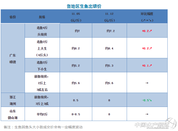 中國水產頻道原創報道, 文|圖 何氏水產 水產前沿 李靜 1、廣東生魚老魚價格在上周末終于止跌回升了,由于現在老魚存塘量越來越少,市場需求量有所增加,新魚魚頭還不夠大,導致老魚統貨價格上升了0.2元/斤,主要看2斤以上大生比例與魚頭來定價。4斤魚頭統貨7.2元/斤左右,魚頭越大成交價越高,2斤以上大生市場行情比上周好,價格比上周漲了0.2元/斤,銷量比上周大;4斤魚頭價格8.4元/斤,5斤魚頭價格在8.5元/斤以上,還是看魚頭與條形來定價。 本周2斤以下小魚市場行情與上周差不多,但客戶更喜歡老魚的小魚,價格上升了0.1元/斤,成交價在5.3元/斤左右。新魚不斷上市,2斤以上3成的統貨成交價還是5.6元/斤左右,總體價格與上周持穩,主要看抓魚的規格與魚頭來定價,預測接下來老魚價格還會微漲,新魚價格暫時變化不大。 2、受到廣東新魚價格低迷的影響,浙江湖州與山東微山湖新魚大量上市,本周價格與上周相比下跌了0.5元/斤。 |