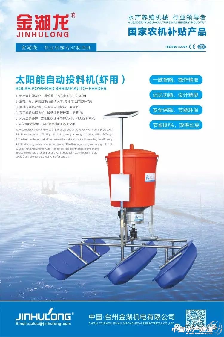 文/圖 水產前沿 李釩 臺州金湖機電有限公司推出了全新的太陽能自動投料機 近期在青島舉辦的第23屆中國國際漁業博覽會上,臺州金湖機電有限公司帶來了全新的產品——太陽能投料機(蝦用),吸引了眾多參會者的目光。 據臺州金湖機電有限公司總經理潘失富介紹,這款太陽能自動投料機具有以下幾個特點: 使用太陽能發電,供給蓄電池充電工作。實現了環保節能。 就算是在沒有太陽,多云或下雨的情況下,電池也可以持續5-7天,使得設備更具有使用連續性; 通過控制器設置,實現全自動投料,更省人工; 采用旋轉拋餌方式,降低飼料破碎率,更節約; 采用優質部件,太陽能板使用壽命25年,PLC控制系統可以使用超過3年,太陽能電池可以使用2年; 節省80%,效率比高。 “一天喂幾餐,一餐喂多少斤,什么時候開始投喂,我們都可以通過簡單的設置完成,省去了很多人工。特別適合于養蝦,因為少量多餐更為科學,也更省料。我們甚至可以設置為晚上投料,這也很符合蝦類晝伏夜出的習性。”潘失富說到。“你只需要將飼料放到料倉,設置好投料模式,其它事都可以不管了。未來,我還計劃加上手機控制功能,使得遠程控制投料成為可能,從而解放了勞動力。” 臺州金湖機電有限公司總經理潘失富與太陽能自動投料機 由于配備了太陽能板和蓄電池,這款設備能解決偏遠地區沒有電力投料機無法使用的窘境,特別適合無電力供應的偏遠地區的大水面養殖,而且還解決了手動投料人工繁重的問題,在不增加人工的前提下,就可以使得投料更為科學。 智能控制系統 投料倉 據潘失富介紹,這款增氧機在南美地區大受歡迎,當地使用自動投料機慢慢會成為一個趨勢,以提高其對蝦養殖的水平,相信在國內的應用前景也非常廣闊。 實際上,一些研究表明,投喂頻率對對蝦生長有積極影響。研究人員在2013年進行的一項研究中比較了二種投喂策略的效率:(1)每天4次人工投喂;(2)使用自動投料機自動投喂,后者無論是日增重還是最終養成規格都優于前者,對成活率也有積極的影響。 就目前而言,大部分手動投料在特定的養殖模式中已被證明是復雜而低效的,因為它沒有考慮與投料有關的對蝦生理因素,因此表達不出南美白對蝦最大的遺傳潛力,從而造成飼料的浪費,并帶來相應的環境和經濟惡果。相信隨著自動投料機的不斷研發和升級,將會逐漸取代人工投料,自動投料機市場也將會迎來爆發式的增長。 在這個背景下,工業化水產發起“尋找中國最好的投料設備”專題活動,試圖找出國內以及國外最好的投料設備,從機械領域為水產養殖升級探路。 |