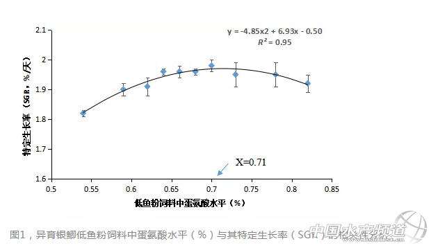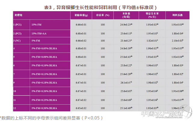 中國水產頻道原創報道,異育銀鯽(Carassius auratus gibelio)為我國廣泛養殖的主要淡水品種之一,具有生長快和風味佳等特點(Xue和Cui,2001)。2017年,異育銀鯽年總養殖產量超過281萬噸(中國漁業統計年鑒,2018)。異育銀鯽的商業飼料中魚粉含量通常在15-20%,但隨著水產養殖業的快速發展,魚粉已供不應求,價格也在不斷上漲,尋找魚粉替代品受到廣泛關注。研制低魚粉飼料可以有效降低水產飼料產業對魚粉的依賴,保證水產養殖業可持續性發展。 文/ 贏創德固賽(中國)投資有限公司動物營養業務線 肖緒誠,高俊 本研究的目的,詣在利用植物蛋白源降低異育銀鯽飼料中魚粉用量,同時添加水產專用DL-蛋氨酸TM(DL-Methionine for AquacultureTM),確定異育銀鯽的低魚粉飼料中最適蛋氨酸和總含硫(TSAA)的含量,以期為制定低魚粉異育銀鯽商業飼料配方提供合理有效的技術支持。 材料和方法 實驗開始前,將均重為6.7g的1080尾異育銀鯽隨機分養到36個玻璃纖維缸的室內循環水實驗系統中,實驗水體為300L,養殖密度為30尾/缸。實驗分為12個處理組,每組三個平行。實驗持續10周,實驗期間平均水溫為26±0.5℃,溶氧大于6.0mg/L。每天四次飽食投喂。 本實驗以魚粉,雞肉粉,豆粕,菜粕和棉粕為主要蛋白源,配置12種等氮等能(36%蛋白,19MJ/kg)飼料飼喂異育銀鯽,包括正對照組(PC1和PC2),負對照組(NC)和負對照組飼料補充九種不同水平的水產DL-蛋氨酸TM處理組(如表1和表2所示)。其中正對照組飼料PC1中含有15%魚粉(飼料1),為商業飼料配方組,沒有額外補充晶體氨基酸,其蛋氨酸含量為6.2g/kg。正對照組PC2(飼料2)為商業飼料配方組補充水產DL-蛋氨酸TM,以達到飼料氨基酸平衡(異育銀鯽肌肉氨基酸含量)的處理組,其蛋氨酸含量為7.8g/kg。負對照組NC(飼料3)為低魚粉組飼料(5%魚粉),該組飼料按照氨基酸平衡模式只補充晶體賴氨酸和蘇氨酸,沒有額外補充蛋氨酸,其蛋氨酸水平為5.4g/kg。飼料4至飼料12為負對照組飼料基礎上添加不同水平的水產DL-蛋氨酸TM,使其飼料蛋氨酸水平分別為5.9、6.2、6.4、6.6、6.8、7.0、7.3、7.8和8.2g/kg(半胱氨酸含量為5.2g/kg)。 主要結果 異育銀鯽生長性能指標如表3所示。飼喂不同蛋氨酸含量飼料的異育銀鯽,其存活率無顯著差異。5%魚粉組(NC)魚體的特定生長率(SGR)最低,而餌料系數最高(p<0.05)。而5%魚粉組補充不同水平的晶體水產DL-蛋氨酸TM后,可顯著提高魚體特定生長率,有效降低餌料系數。當5%魚粉組飼料中添加0.1-0.2%水產DL-蛋氨酸TM后,其飼喂的魚體生長性能和15%魚粉組無顯著差異。二次方程回歸分析得出,在低魚粉情況下,異育銀鯽飼料最適蛋氨酸水平為7.1g/kg,總含量氨基酸含量為12.3g/kg。 主要結論 外源添加水產DL-蛋氨酸TM可有效降低飼料中的魚粉使用量,保證魚體的正常生長性能。5%魚粉組飼料中添加0.1-0.2%的水產DL-蛋氨酸TM(總蛋氨酸含量6.4-7.3g/kg)與15%魚粉組的魚體生長性能無顯著差異。 二次回歸分析得出,在低魚粉異育銀鯽飼料中,最適蛋氨酸含量和總含硫氨基酸含量分別為7.1g/kg和12.3g/kg(圖1)。且本實驗飼料中添加0.18%的水產DL-蛋氨酸TM可達到其最適蛋氨酸水平。 低魚粉飼料的餌料系數,隨著晶體DL-蛋氨酸TM添加量的增加而顯著降低。當飼料的蛋氨酸含量達到7g/kg(添加0.18%的水產DL-蛋氨酸TM)時,鯽魚餌料系數最低(圖2),且和正對照處理組(PC2)無顯著差異。 |