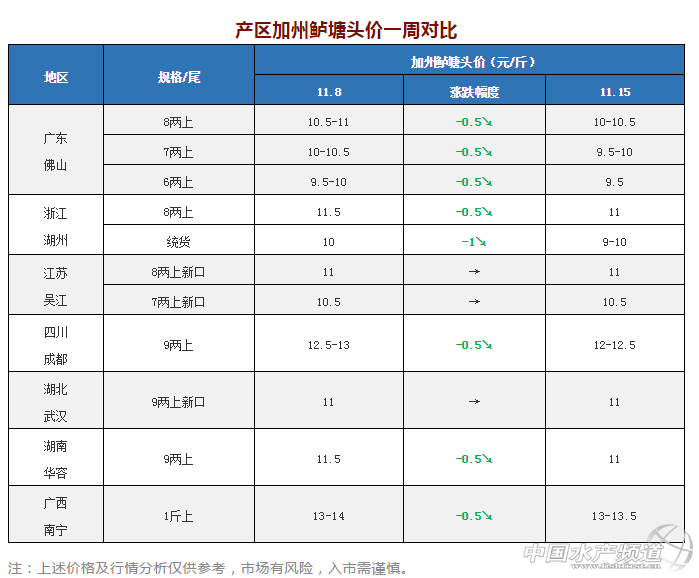 中國水產頻道原創報道, 養好魚,更要賣好魚! 加州鱸行情周報 《鱖鱸前沿》與您相約每周四 文/圖 水產前沿 李曉欣 廣東佛山 本周佛山各規格加州鱸新魚下跌了0.5元/斤,今天6兩上報價9.5元/斤,7兩上9.5-10元/斤,8兩上10-10.5元/斤,實際成交價看魚頭大小及8兩上比例。由于魚價較為低迷,養戶出魚意愿不高,部分養戶擔心魚超標,多選擇出大規格魚來提高產量和效益。現在市場上大魚比例有所增大,吸引外省流通商到本地拉魚增多,預計短期內魚價以持穩為主。 浙江湖州 本周湖州魚價有所下滑,8兩上今天報價11元/斤左右,相比8日11.5元/斤下跌了0.5元/斤;統貨今天報價9-10元/斤左右,比8日10元/斤下跌了1元/斤。現在湖州新口鱸魚上市量大,但因廣東魚價相對便宜,當地流通商南下收魚較多,對本地魚價有所影響,預計短期內魚價維持目前價位。 江蘇吳江 本周吳江新口魚價一周持穩,今天7兩上報價10.5元/斤,8兩上11.5元/斤,市場以出8兩上規格為主。目前魚價基本上已經達到臨界點,養殖戶觀望心理增強,部分魚車到廣東收魚。 四川成都 成都今天9兩上報價12-12.5元/斤,相比上周12.5-13元/斤下跌了0.5元/斤。受外地魚沖擊市場影響,成都魚價有所下滑,目前價格未達養戶心理價位,總體出魚積極性不高。 湖北武漢 本周武漢9兩上加州鱸價格維持在11元/斤左右,目前的價位養戶出魚意愿不高,市場上以廣東魚為主。有部分養戶擔心魚超標而挑頭魚出魚,但總體出魚量不大。 湖南華容 本周華容9兩上加州鱸下滑了0.5元/斤,今天9兩上報價11元/斤左右。受廣東和江蘇新魚上市增多影響,近期華容本地魚銷量上不去,部分養戶在排隊出魚,魚價有所回落。 廣西南寧 廣西南寧加州鱸13-14元/斤的價格持穩了半個多月,在本周出現下滑,今天1斤上報價13-13.5元/斤。現在南寧本地魚達上市規格的還比較少,當地流通商多到廣東拉魚,市場上以廣東魚為主,本地出魚量不大。 |