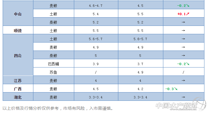 中國水產頻道原創報道,今年是鱖魚價格同期相對最高的一年,也是臭鱖魚加工廠相對最艱難的一年 文/圖 水產前沿 李靜 本周,各地鱖魚幾乎全線上漲。廣東、江蘇、湖南、湖北、江西、安徽、山東七省分別上漲0.5-1元/斤,唯一還沒調價的廣西也有可能近日上漲。為什么今年各地鱖魚價格不僅不跌還漲勢強勁呢?可能主要還是跟廣東鱖魚養殖成本高企,養戶惜售有關。 今天,廣東鱖魚開塘價格表現比較混亂,30-31元/斤都有,但這個價位還未達養戶預期,惜售心理仍然較強。而終端市場需求并沒有什么起色,只是臭鱖魚加工廠的凍庫缺口很大。今年是鱖魚價格同期相對最高的一年,也是臭鱖魚加工廠相對最艱難的一年,臭鱖魚加工廠在高漲的鱖魚原料面前進退兩難。 本周,各地餌料魚價格整體保持高位運行或穩中有升,部分地區巴西鯛跌幅明顯。 |